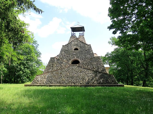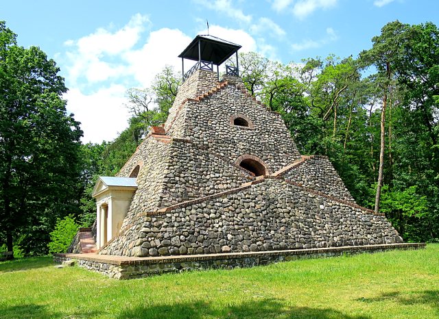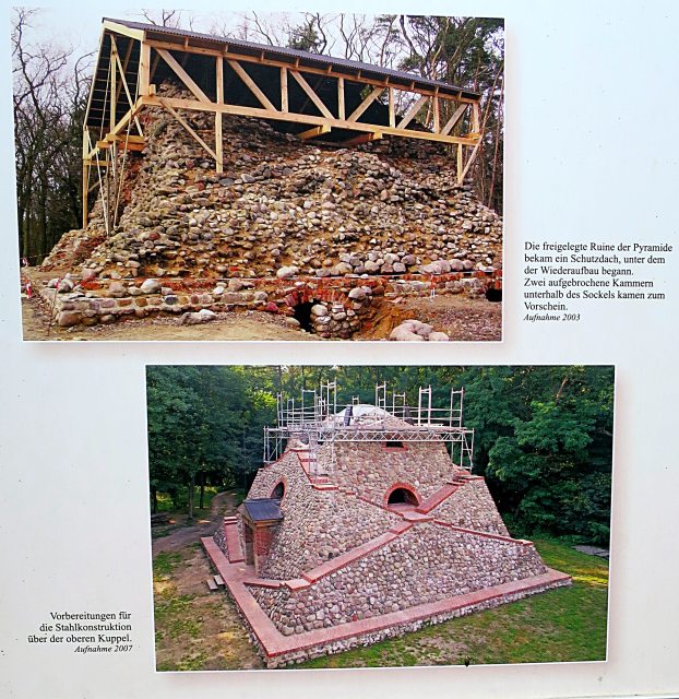 Die wiedererstandene, knapp 14 Meter hohe, vierstufige Feldstein-Pyramide, deren Eingangsseite mit dem vorgesetzten Sandstein-Portal, nach Süden orientiert ist. Sie erhielt ihr ursprüngliches Aussehen zum zweiten Mal.
