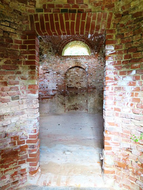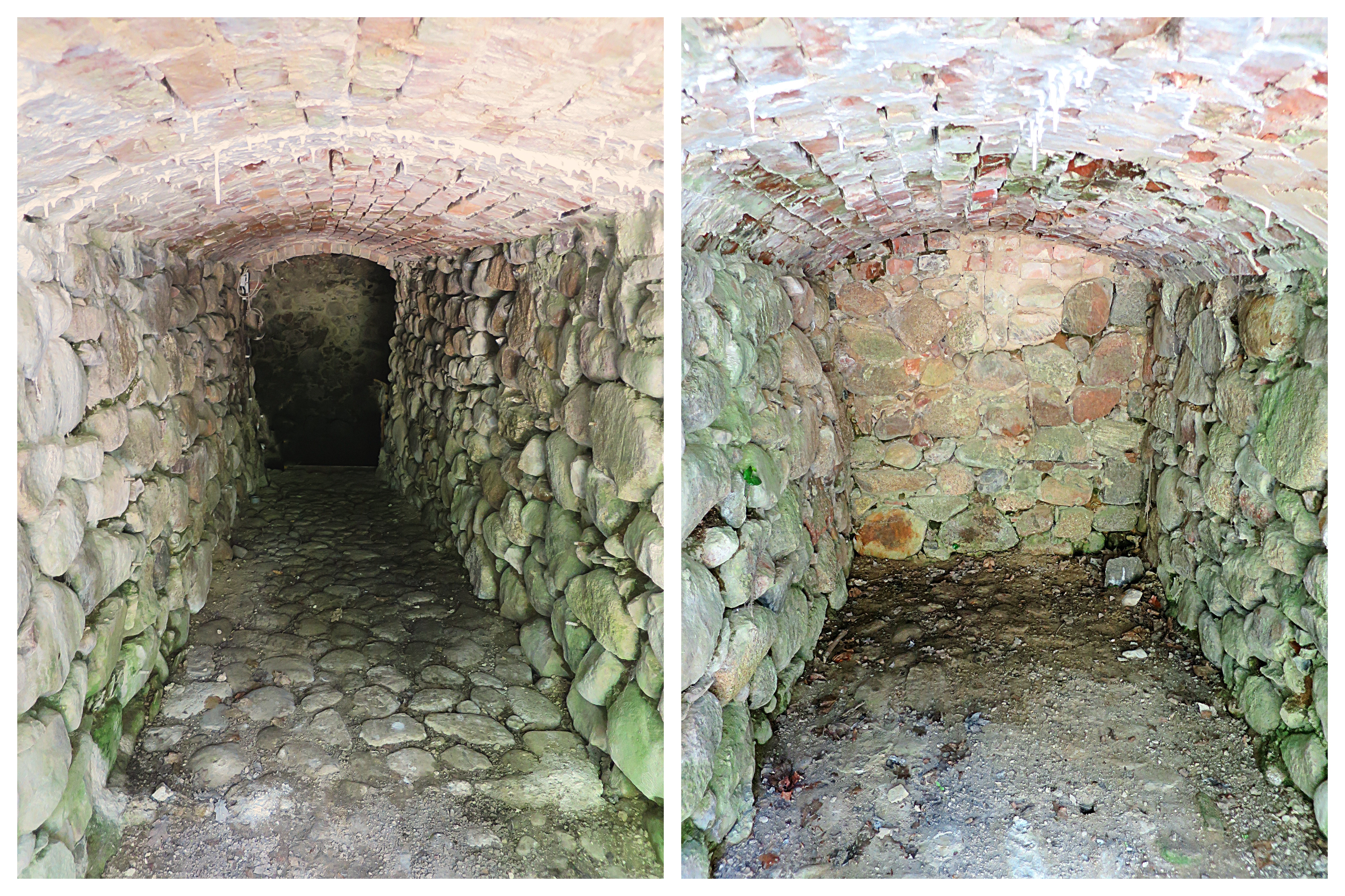 Die Nordseite der Pyramide lässt Einblicke in das Untergeschoss zu. Drei Gänge an der Nordseite, von denen der mittlere (hier links im Bild) in einen Gewölbekeller, unter dem Saal liegend, führt. Ein Keller-Verließ war von jeher nicht vorgesehen.