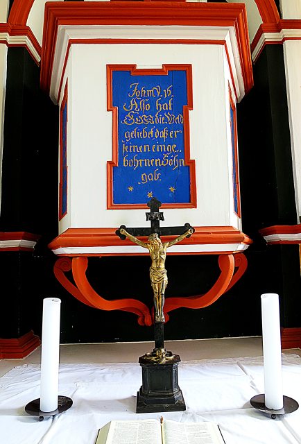 Der farbenkräftige Kanzelaltar aus der Zeit des beginnenden 18. Jahrhunderts. Der Kanzelkorb ist mit drei biblischen Sprüchen in goldener Schrift auf tiefblauem Grund verziert, der gesamte Kanzelaufbau von goldbronzierten Akantusranken eingefasst.