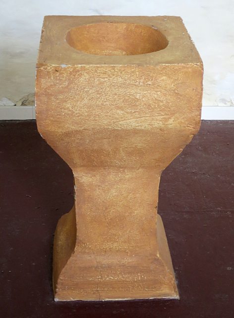 Das Taufbecken wurde etwa am Übergang vom 15. zum 16. Jahrhundert von einem uns nicht namentlich überlieferten Meister aus Kalkstein gearbeitet und ist in einem „warmen“ Ocker farbbeschichtet. Zu diesem Taufstein gehört als Einsatz die schlichte Metallschale, die das Taufwasser aufnimmt.