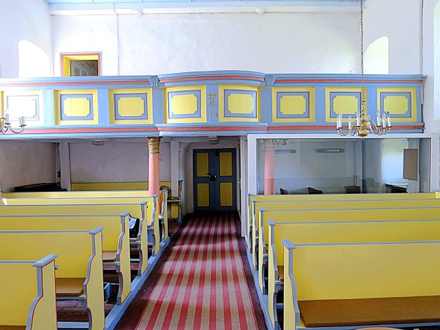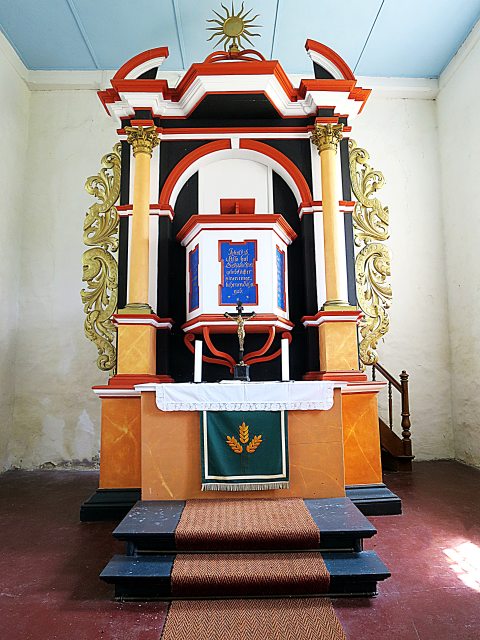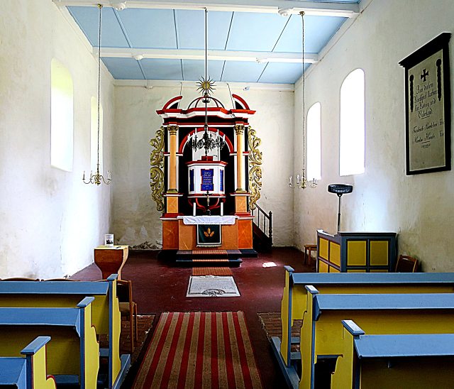 Das Kirchenschiff in Blickrichtung nach Osten. Das Kirchenschiff ist reichlich 24 m lang und knapp 11 m breit. Die Dicke der Mauern beträgt etwa 123 cm. Mittig im Chor der Kanzel-Altar in kräftig-farbenfroher Gestaltung und davor die in den Fußboden eingelassene helle Grabplatte für das Gedenken an den verehrten Hofrat Johann Casper v. Berger, der viel für die Gemeinde getan hat. Darüber an zentraler Stelle im Chorraum der Kronleuchter aus Messing, der wohl etwa um 1850 gearbeitet wurde. Dieser hing früher im Herrenhaus und wurde 1911 der Kirche gespendet. Links: das Taufbecken. Rechts: ein weiteres Lesepult, wenn der Prediger seine Stimme schonen will, „das Wort“ nicht von der weiter entfernten Kanzel verkündet.