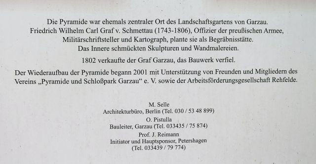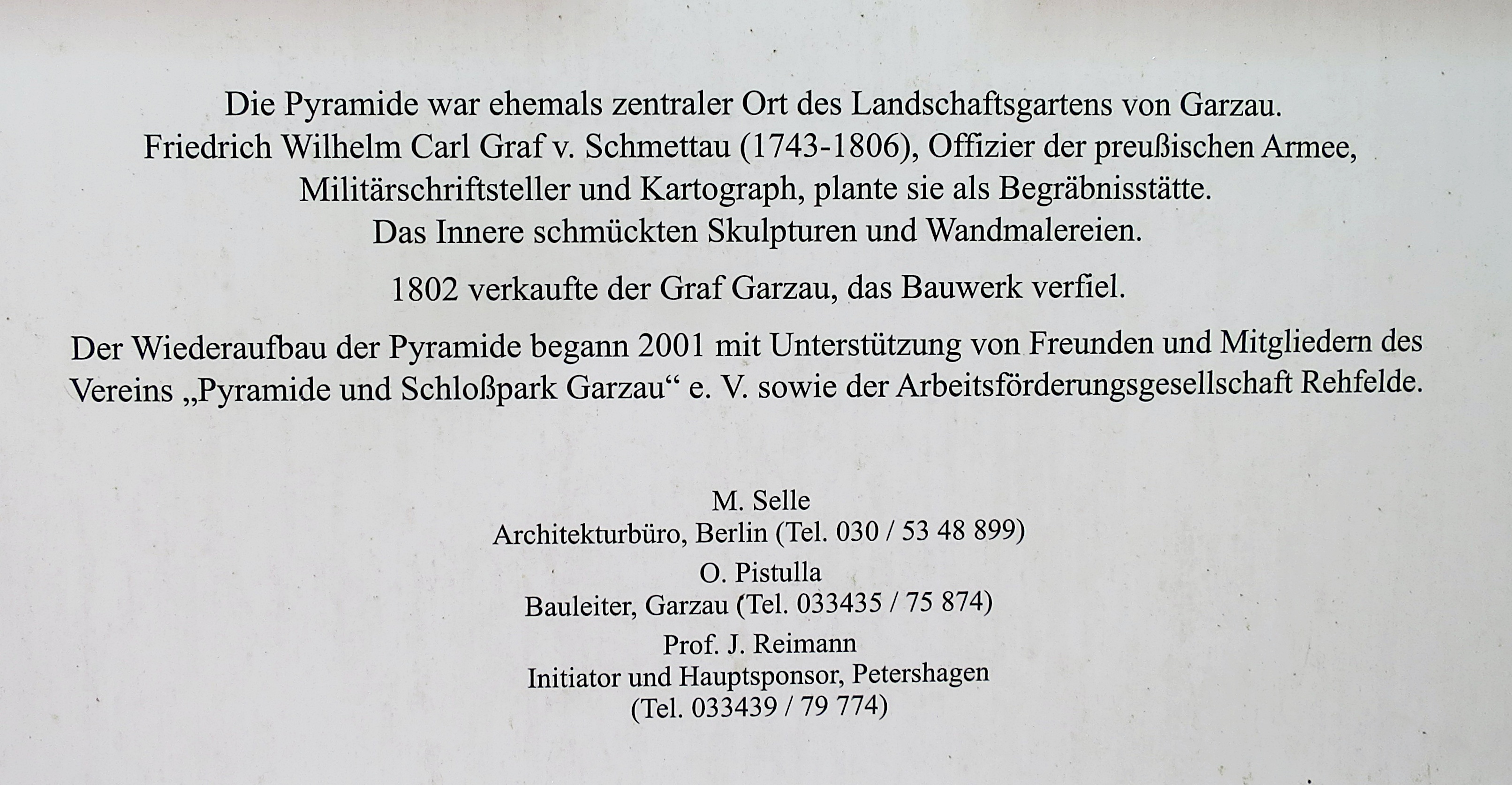 Hinweis auf genutzte Literatur: - Informationsblatt der Kirchengemeinde über die Kirche und ihre Ausstattung, - Informationstafeln an der Pyramide Garzau. - Erläuterungen zur Pyramide von Prof. J. Reimann als Internetdokument.