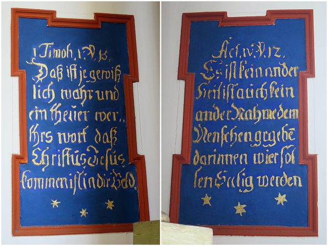 Der Kanzelkorb zeigt an jeder der drei Seiten einen biblischen Spruch. So sehen wir außer dem soeben gezeigten, seitlich diese beiden Bibelstellen: