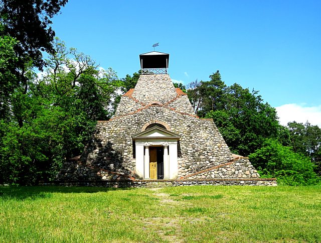 Wir nutzen den kopfsteingepflasterten Gutsweg und biegen bald nach links, in westliche Richtung zur Pyramide ab. Die Wege sind ausgeschildert ... und schon bald sind wir am Ziel dieses Spaziergangs.