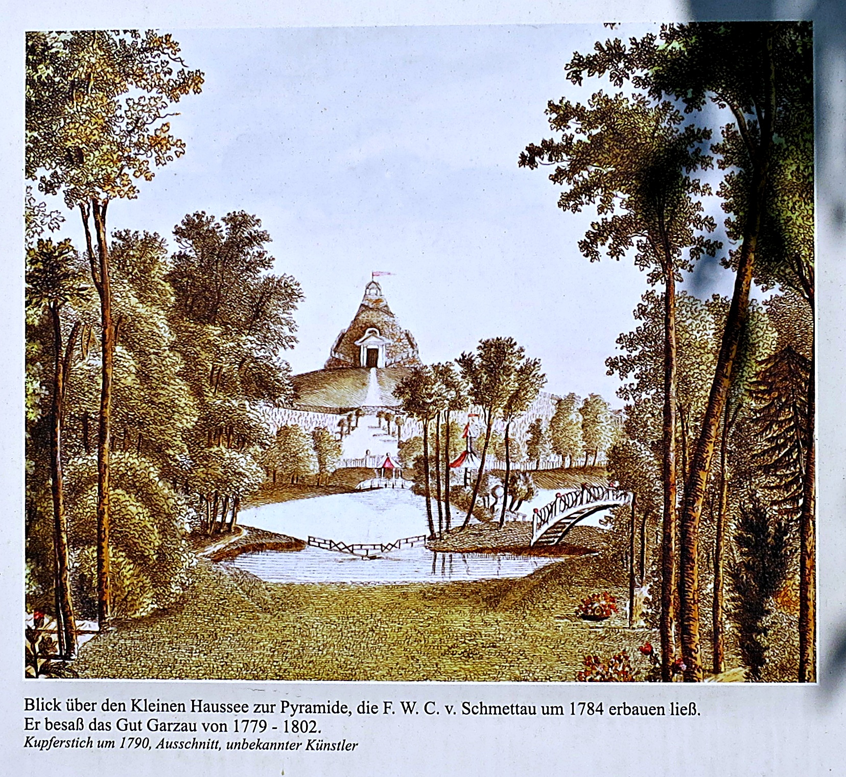Weitaus vorher, im Jahr 1780 hatte der Graf Friedrich Wilhelm Carl v. Schmettau (1743–1806) begonnen, nördlich des Dorfes einen Landschaftspark einzurichten. Herr v. Schmettau war ein Armee-Offizier, Kartograph und Schriftsteller auf dem Gebiet des Militärwesens. In diesem entstehenden Landschaftspark wurde nahe am kleinen Haussee an der zentralen und erhöhten Stelle des Parks eine große Feldsteinpyramide als Grabmal gebaut, eine Rarität, die ihresgleichen hinsichtlich Größe, Materialwahl und Schönheit in Deutschland vergeblich sucht. An den sanften Hängen dieses Pyramidenhügels wuchs an Rebstöcken der Wein heran.