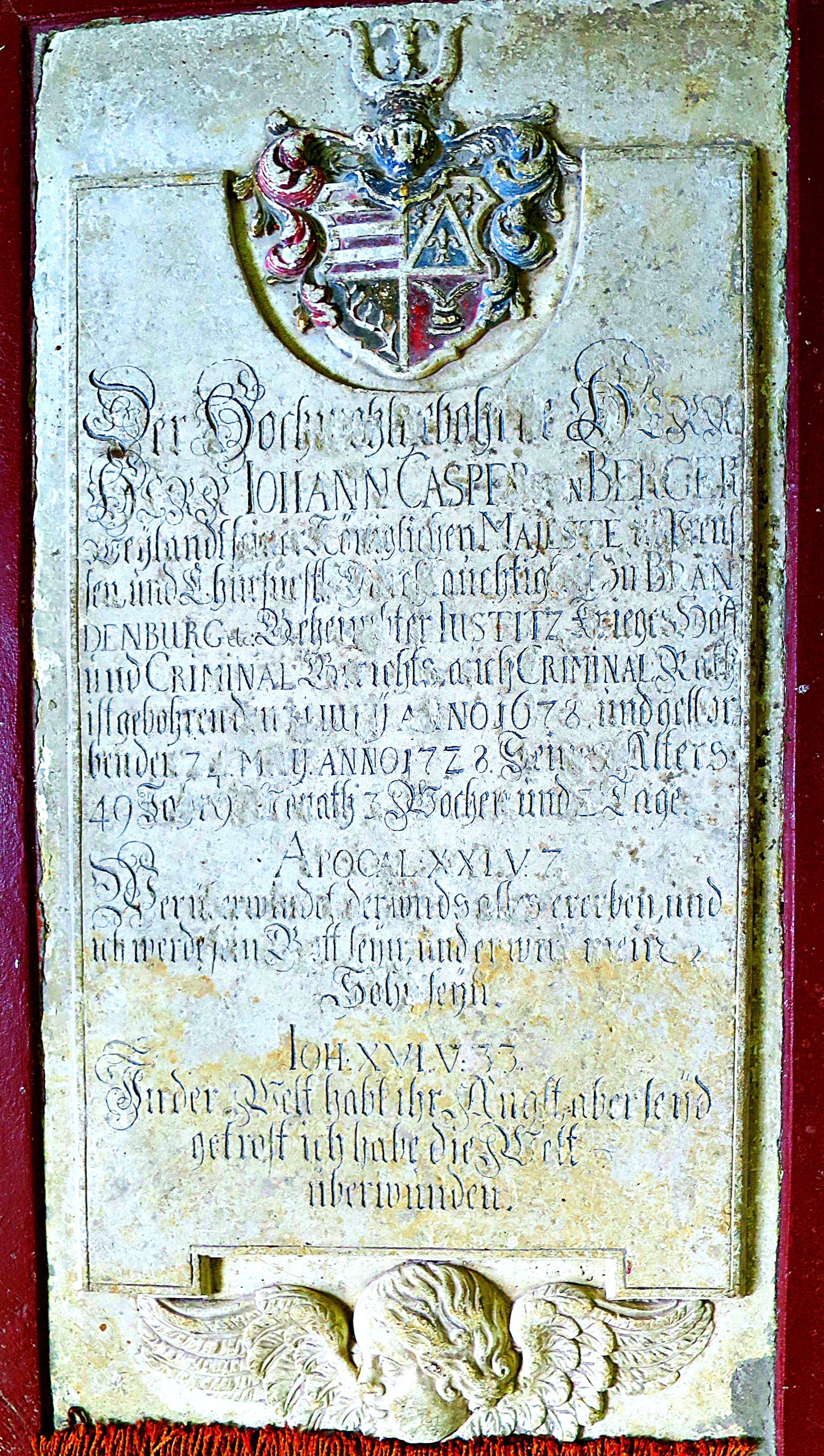 Der Hochwohlgebohrene Herr. Herr Iohann Casper von Berger, weylandt seiner Königlichen Majestet in Preußen und Churfürstlich Durchlauchtigster zu Brandenburg etc. Geheimer Iustiz-, Kriegs-, Hof- und Criminal-Gerichts-, auch Criminal-Rath, ist geboren den 21. July Anno 1678 und gestorben den 14. May Anno 1728. Seines Alters 49 Jahr, 9 Monath, 3 Wochen und 2 Tage.