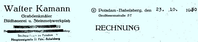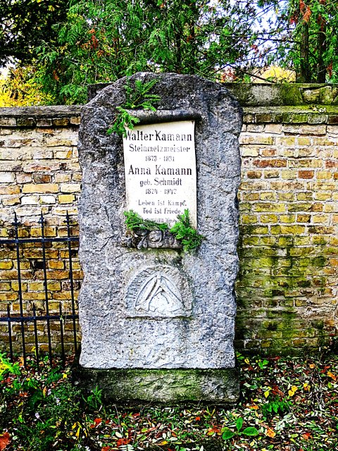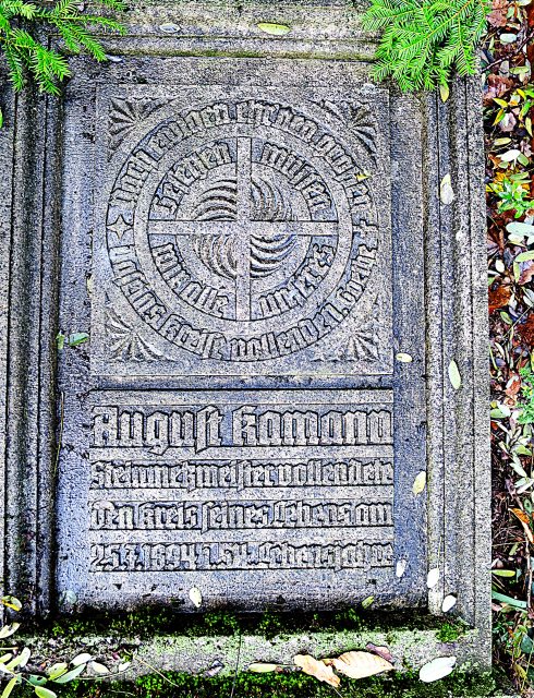 „Nach ewigen ehern großen Gesetzen müssen wir alle unseres Daseins Kreise vollenden.“ Der Steinmetzmeister, Sohn Walter Kamann, ergänzte: „August Kamann, Steinmetzmeister, vollendete den Kreis seines Lebens am 25. 7.1894 im 54. Lebensjahre.“