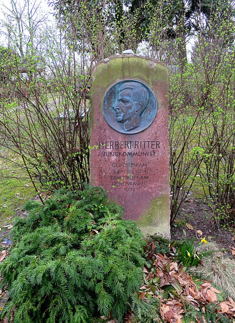 Er war als Jugendlicher in der Neuendorf-Drewitzer Lokomotiv-Fabrik >Orenstein & Koppel< beschäftigt. Ab 1930 gehörte er dem >Kommunistischen Jugendverband Deutschlands< an. Am 12. November 1931 wurde er auf dem Heimweg von einer politischen Veranstaltung von einem National-Sozialisten der Schutzabteilung (SA) auf dem Friedrichplatz (=> Weberplatz) erschossen. Herbert Ritter wurde nur 17 Jahre alt. – Walter Klausch schuf für seine ursprüngliche Grabgestaltung einen kupfernen Gedenkstern. Klausch wurde zwei Jahre später ebenfalls ermordet.