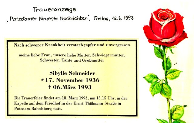 Für einige weitere Personen, für die es keine Grabsteine mehr gibt, habe ich ersatzweise zumindest auf dem Papier eine einfache „Grabtafel“ beigestellt, mit den Angaben, die mir noch geläufig sind. Die begrenzte „Ruhezeit“ und die nachfolgende Neubelegung der Stellen, ließ die Erinnerung oftmals bald verblassen. Noch schneller das Vergessen, wenn Angehörige die Grabstelle nur kurze Zeit pflegten oder Jene selber, noch innerhalb der Ruhezeit ihrer gestorbenen Angehörigen, aus dem Leben schieden. Mit der Bewahrung des Erinnerns kann man hingegen sagen: Diese erwähnten vormaligen Familienglieder oder Nachbarn sind nicht vergessen – sie sind noch unter uns.