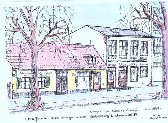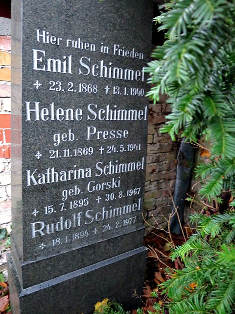 Die Gärtner-Familie Schimmel lebte seit 1890 in Neuendorf, Großbeerenstraße, später, ab 1933 in der Eisenbahnstraße, dann in der Lindenstraße 89 => Rud- Breitscheid-Straße 31 und letztendlich gegenüber, im linken Laden des Stoffhauses Thal, Rud.-Breitscheid-Str. 41.