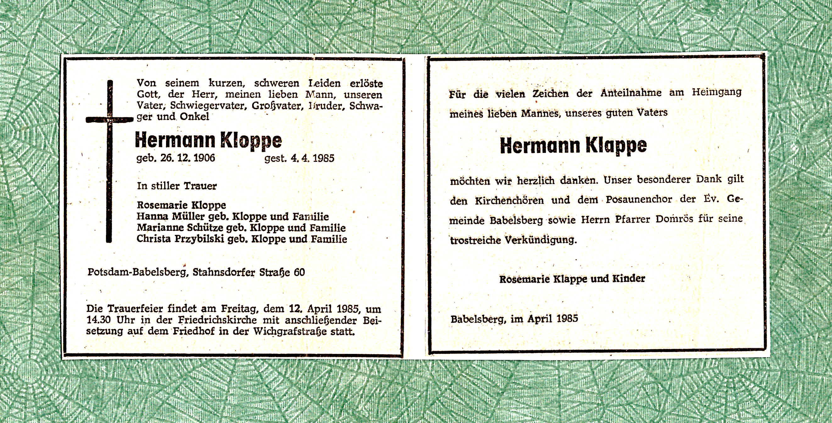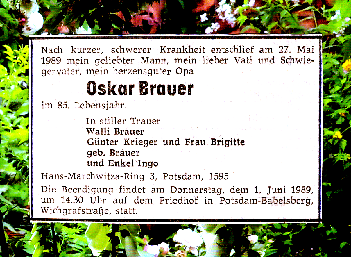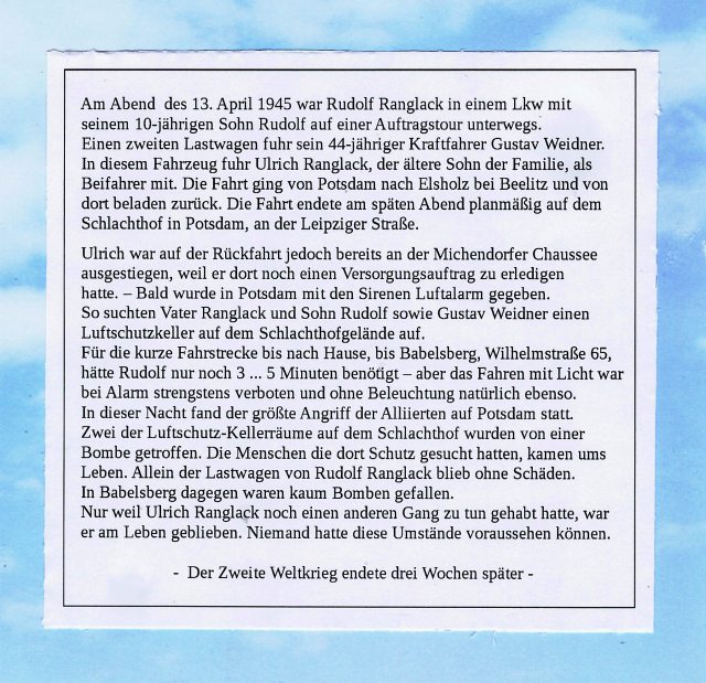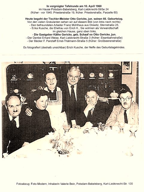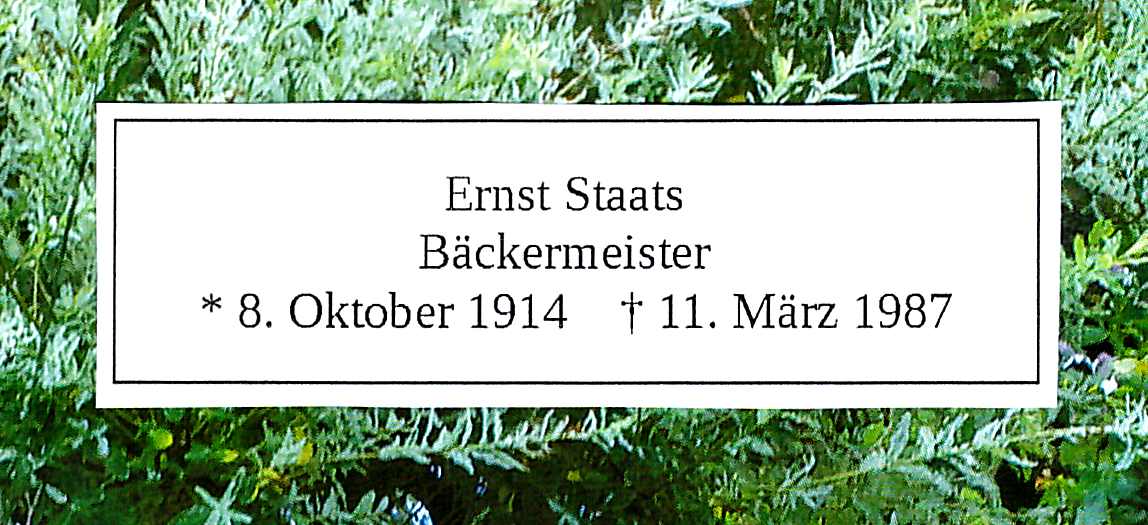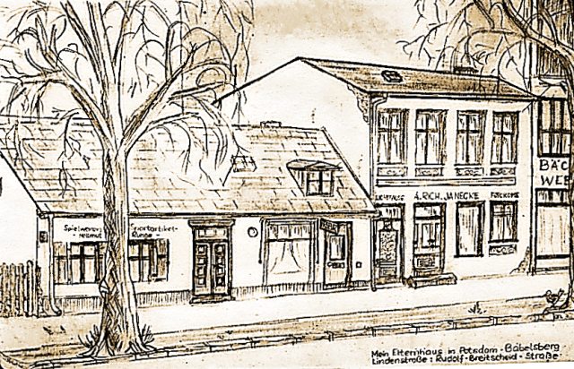Die Familie des Bäckermeisters Staats wohnte früher in Potsdam, Berliner Straße 8 => Stalinalle 8, später in Babelsberg, Karl-Liebknecht-Straße.