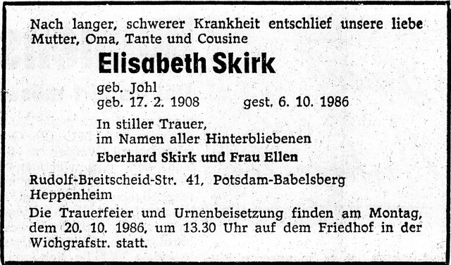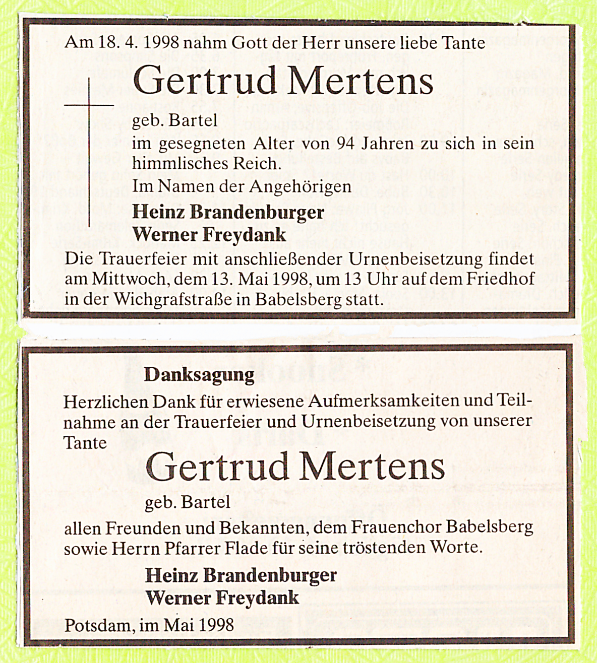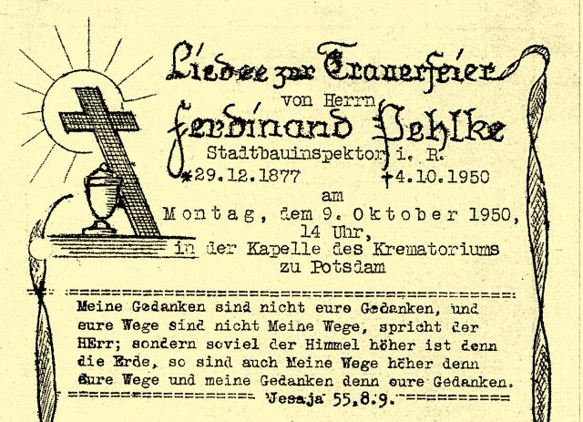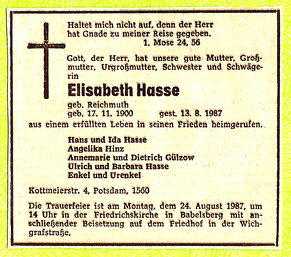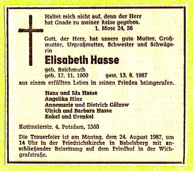 Die Familie des Bäckermeisters Staats wohnte früher in Potsdam, Berliner Straße 8 => Stalinalle 8, später in Babelsberg, Karl-Liebknecht-Straße.
