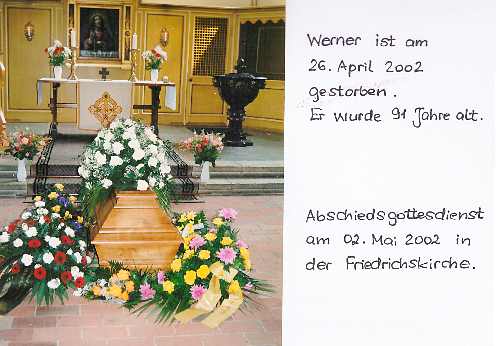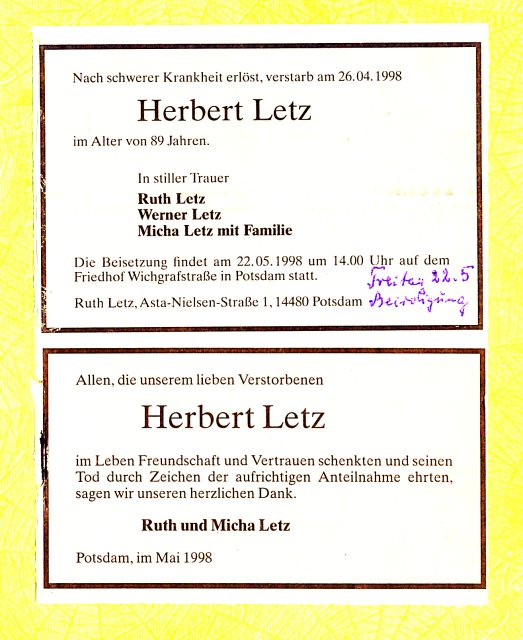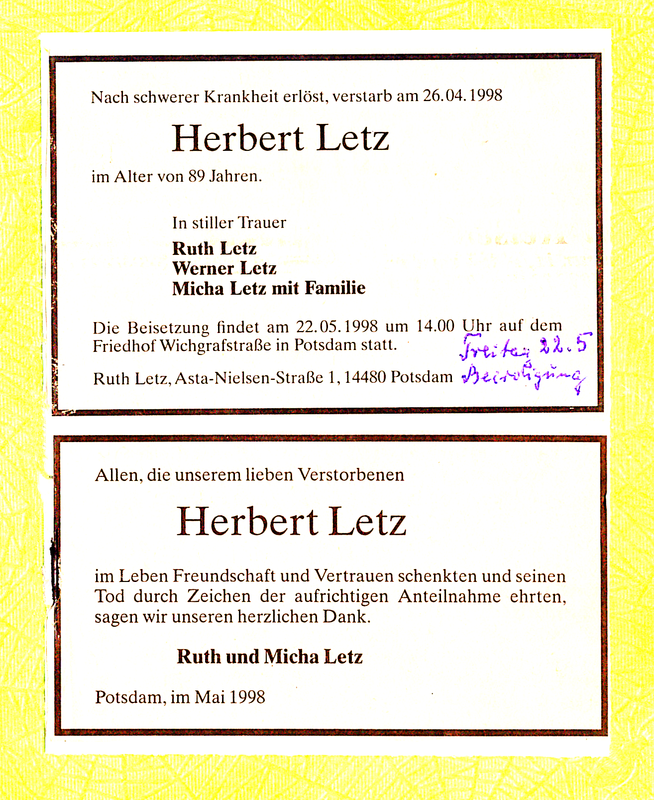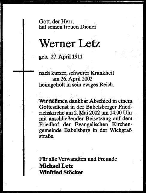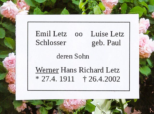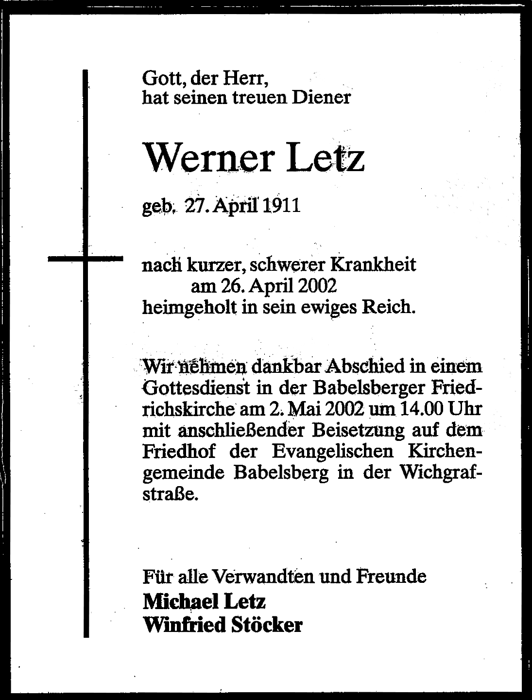 Letz, Werner Hans Richard wurde in Neuendorf, Yorckstraße 17 geboren und am 26. Dezember 1911 in der Bethlehemkirche von Pfarrer Schlunk getauft.