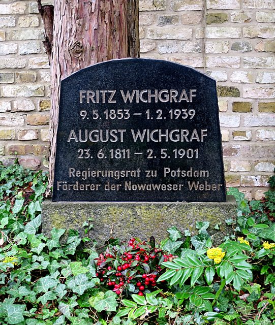 Tatsächlich ruhen August Wichgraf und sein Sohn Fritz, der als Kunstmaler auch an der Ausmalung in der Nikolaikirche gearbeitet hatte, auf dem Bornstedter Friedhof. Augusts Ehefrau, die bereits ein Jahrzehnt früher gestorben war, wurde in der Gruft des benachbarten Erbbegräbnis ihres Familienverbandes Wilckens bestattet.