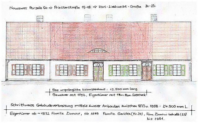 Parzelle 60 => Priesterstraße 18 / 19 => K.-Liebknecht-Str. 23 / 24. Mittig das übliche 5-achsige Kolonistenhaus, später rechts und links mit einem Anbau versehen. Rechts das heutige Stadtteil-Museum „Weberstübchen“.