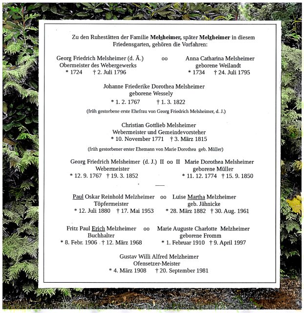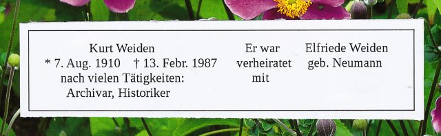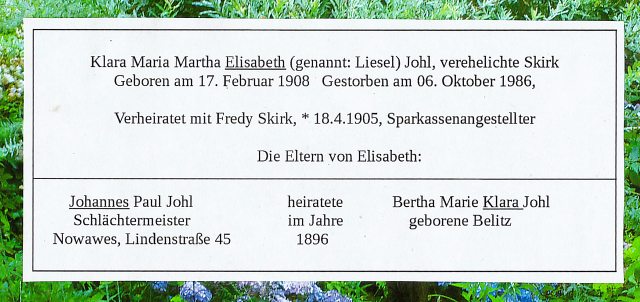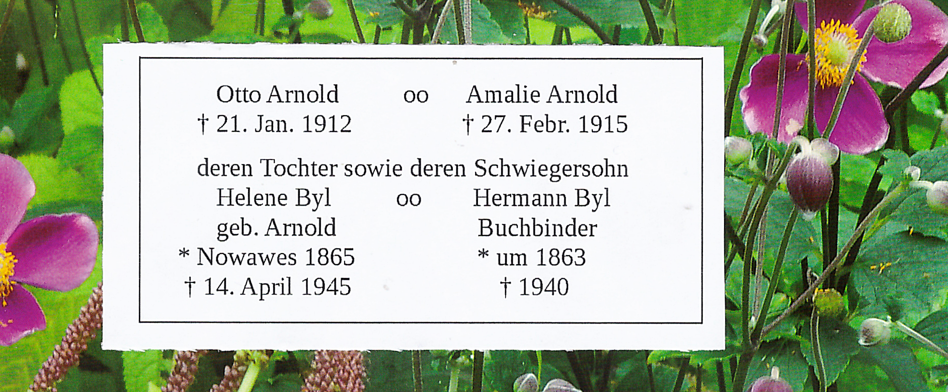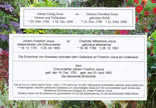 Für einige weitere Personen, für die es keine Grabsteine mehr gibt, habe ich ersatzweise zumindest auf dem Papier eine einfache „Grabtafel“ beigestellt mit den Angaben, die mir noch geläufig sind. Die ursprüngliche Nowaweser Bevölkerung, im wesentlichen aus Webern, Spinnern und einigen anderen Handwerkern bestehend, galt als arm. So finden wir hier keine sehr alten kostbaren Grabdenkmale, die den Zeitabläufen widerstehen konnten. Oft musste man sich mit einem einfachen Holzkreuz begnügen, das bald dem Witterungszerfall anheimgestellt war. Auch die begrenzte „Ruhezeit“ und die nachfolgende Neubelegung der Stellen, ließ die Erinnerung oft bald verblassen. Noch schneller das Vergessen, wenn Angehörige die Grabstelle nur kurze Zeit pflegten oder sie selber noch innerhalb der Ruhezeit ihrer Angehörigen aus dem Leben schieden. Mit dem Bewahren des Erinnerns kann man dagegen sagen: Diese erwähnten Familienglieder oder Nachbarn sind nicht vergessen – sie sind noch unter uns.