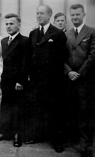 Gruppenbild im Hof des Hauses Wichgrafstraße 22 am 1. Mai 1936. Von links nach rechts: Christlieb Albrecht, Adolf Lüscher, Anton Bernhart, Reinhold Matzke