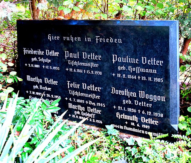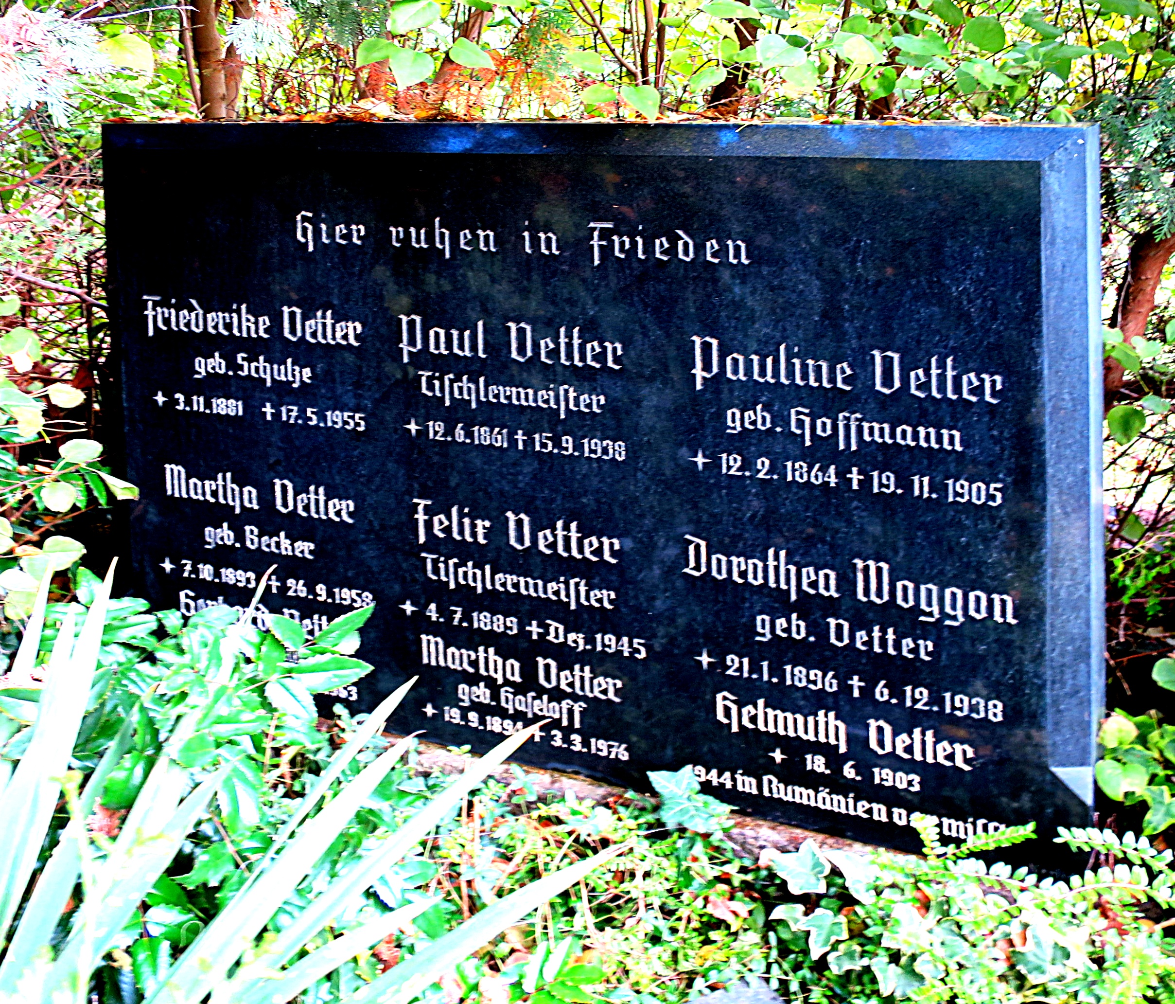 Einige Glieder des weit verzweigten Familienverbandes Vetter. Der Eintrag zu Helmuth Vetter (unten rechts) erfuhr später eine traurige Berichtigung: Gestorben als Soldat am 09. Dezember 1944 in Stalingrad, Sowjetunion.