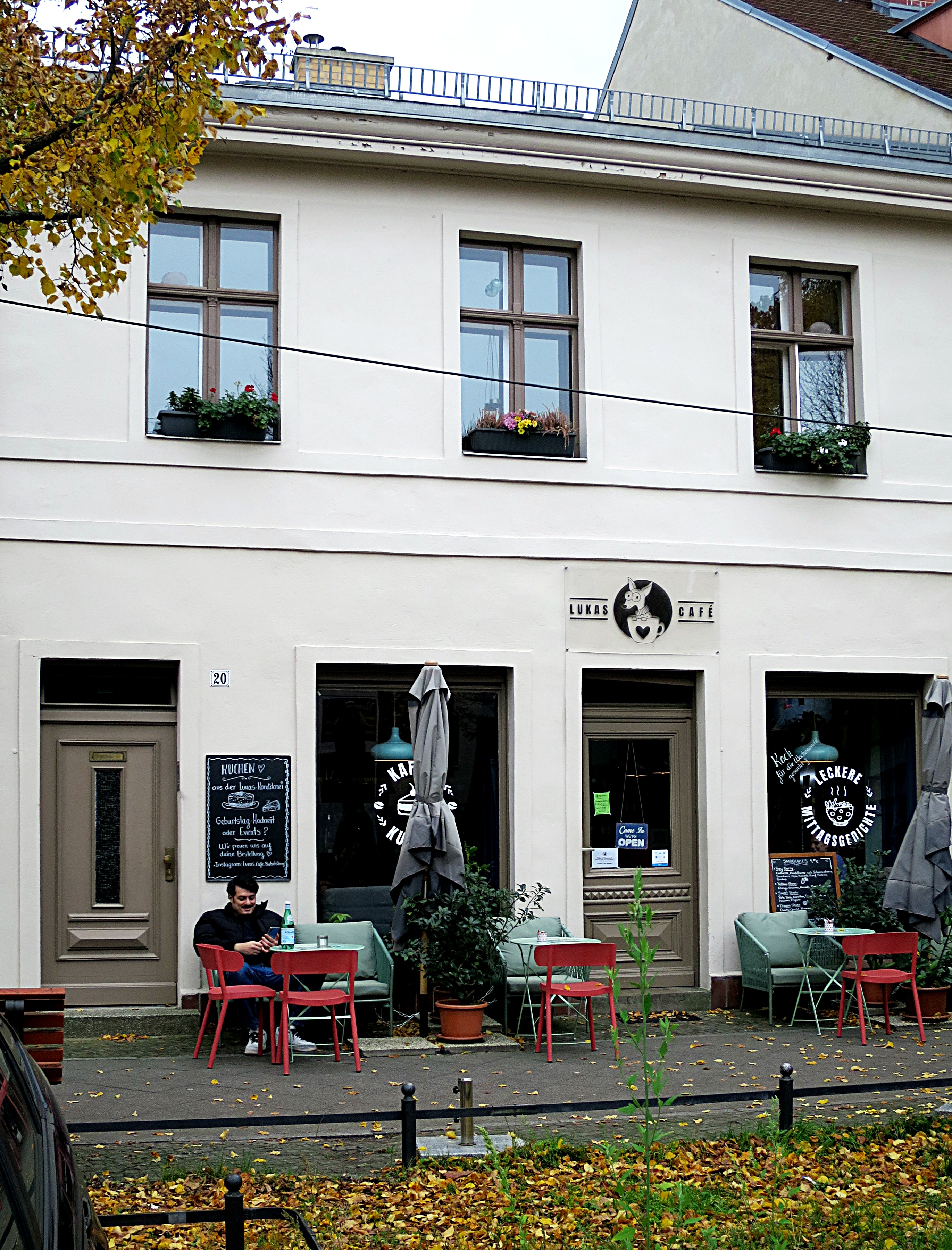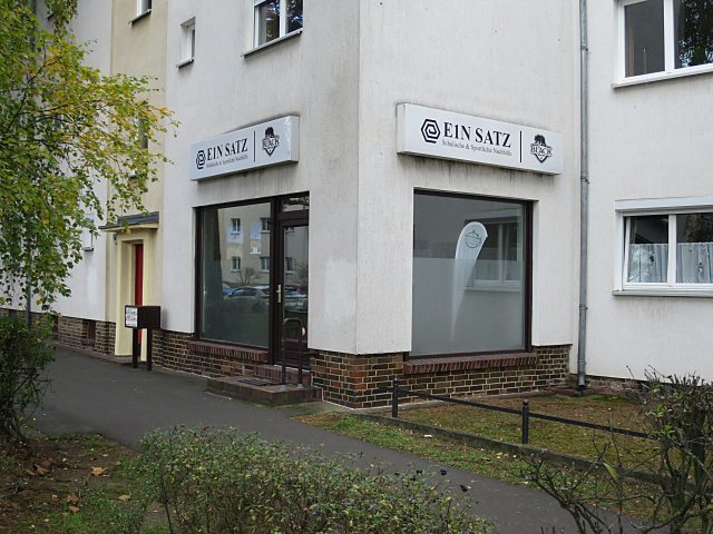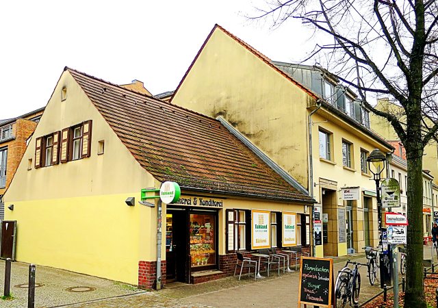 Die Bäckerei / Konditorei in der Rudolf-Breitscheid-Straße 15, links im Gebäude, mit der lindgrünen Ladentür zwischen den großen Schaufensterscheiben.