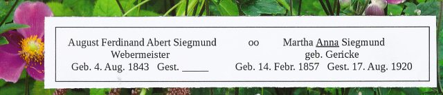 Webermeister Albert Siegmund. Seine Frau Anna stammt aus der Tischler-Familie Gericke, Priesterstraße => Karl-Liebknecht-Straße.