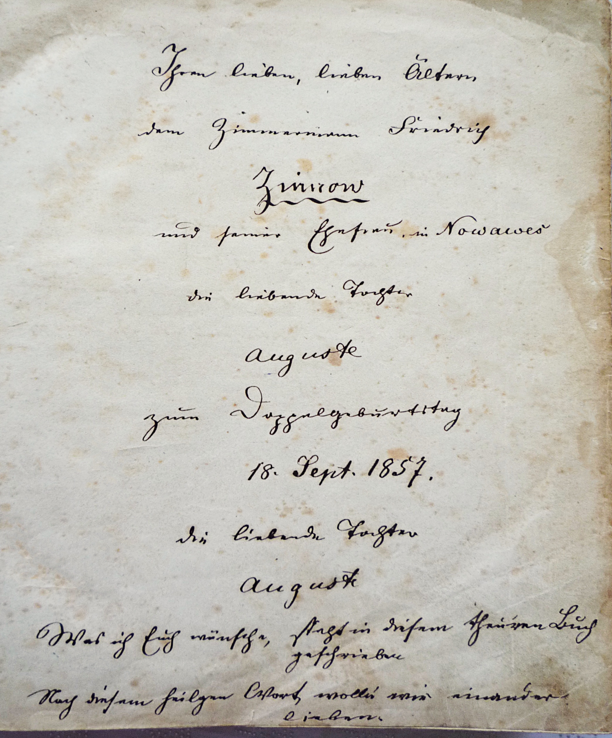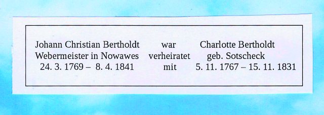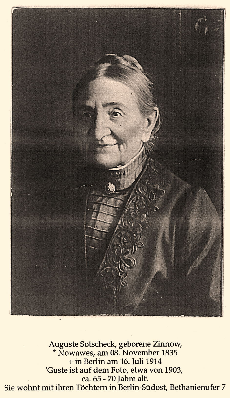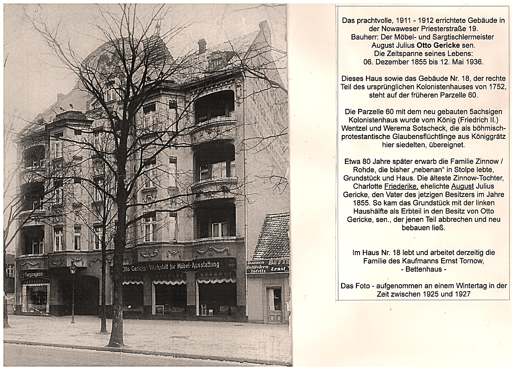 Der Zimmermann Wilhelm Zinnow zog mit seiner Familie um 1832 von Stolpe nach Nowawes, auf das Grundstück mit der späteren Bezeichnung Priesterstraße 18 => Karl-Liebknecht-Str. 23. Das ist die zeitgenössische Parzelle Nowawes 60, deren Erstbewohner 1751 die Familie Sotscheck aus Königgrätz war. Sie lebten also im damals noch originalen Haus ... von dem heute nur noch der Anbau „Weberstübchen“ erhalten ist.
