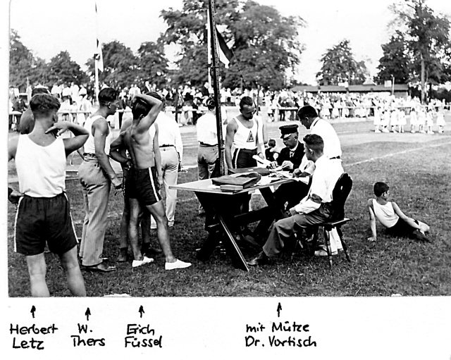 Ein Bild aus der Zeit, als das Karl-Liebknecht-Stadion noch nicht „Karli“ genannt wurde, sondern schlicht: Sportplatz Priesterstraße. Sportfest am 28. Juni 1935. Ein heißer Tag. Am Tisch sitzt Herr Dr. Vortisch, als Leiter des „Ortsausschuss für Jugendpflege in Nowawes“ und erfasst die Leistungen der jungen Athleten. An einem benachbarten Tisch fertigt A. Rich. Janecke gleich die Sport-Urkunden in Kunstschrift aus.