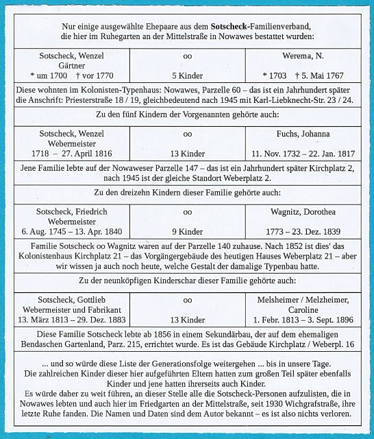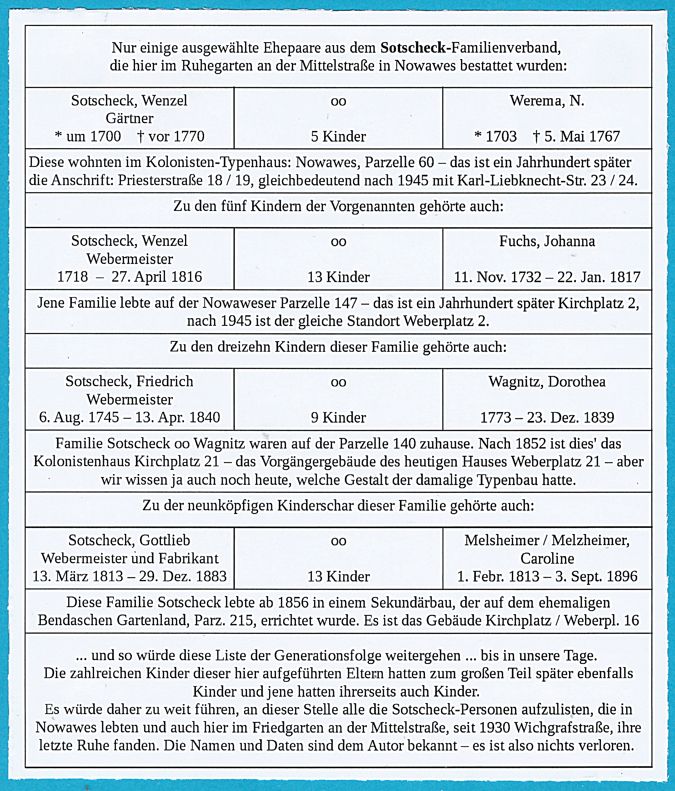 Die ersten Sotschecks, Waclaw = Wenzel und die Seinen, erhielten als Kolonisten aus Böhmen, die Parzelle 60. Das ist die Priesterstraße 18 / 19 => Karl-Liebknecht-Straße 23 / 24. – Zeit ist vergangen!