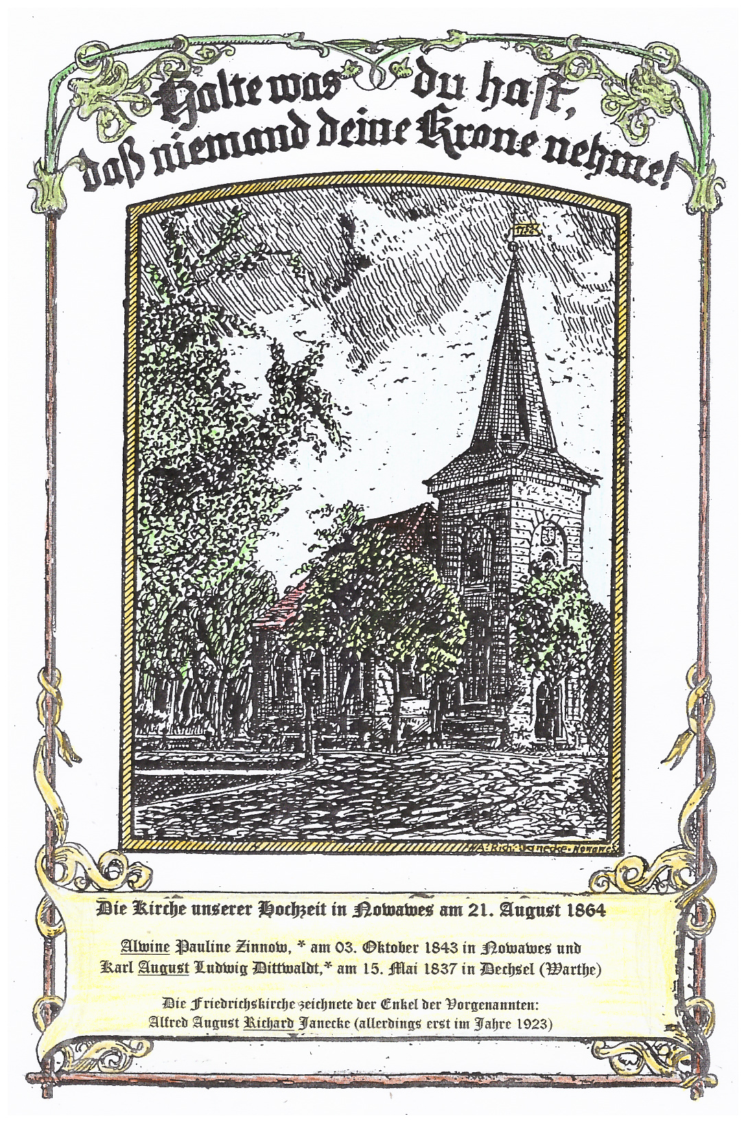 Zeitungsauschnitt einer Ehrung seitens der Nowaweser Vereine, im November 1897 – nachträglich in ein Schmuckblatt gesetzt.