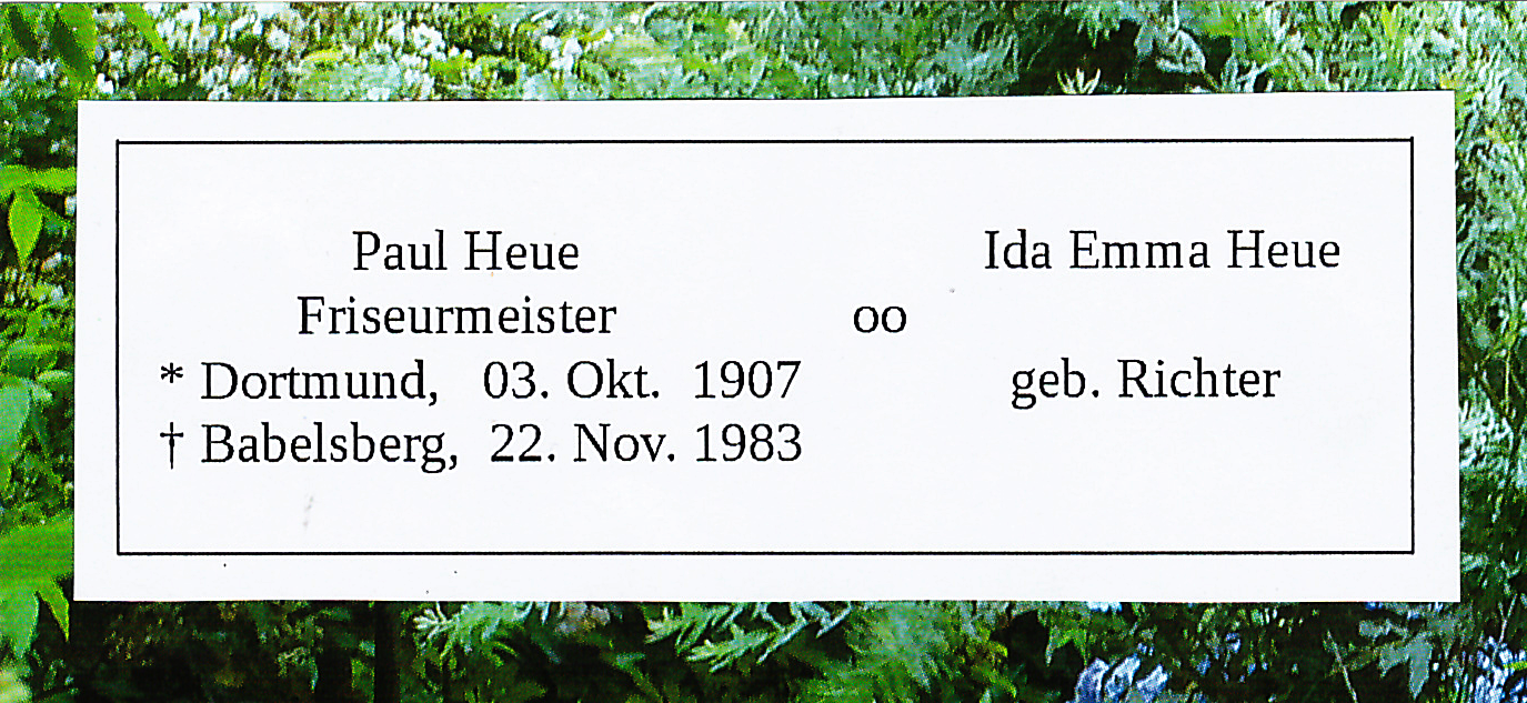Wer von den älteren Babelsbergern kennt nicht Paul Heue? Viele Damen saßen bei ihm unter der Haube. Er hatte seinen Frisiersalon in der Lindenstraße 40 (nach 1945: Rudolf-Breitscheid-Straße 45) in einem der alten Kolonistenhäuser, die dem Bahnhof gegenüberstehen. Das Erdgeschoss teilte er sich mit Helene und Hellmut Runge: Spielwaren und Sportartikel. Im Dachgeschoss lebte Familie Wagner, jun. Heue hatte 1933 in Niemegk die Emma Richter geheiratet und bald wohnten sie in Nowawes, Siemensstraße 11.