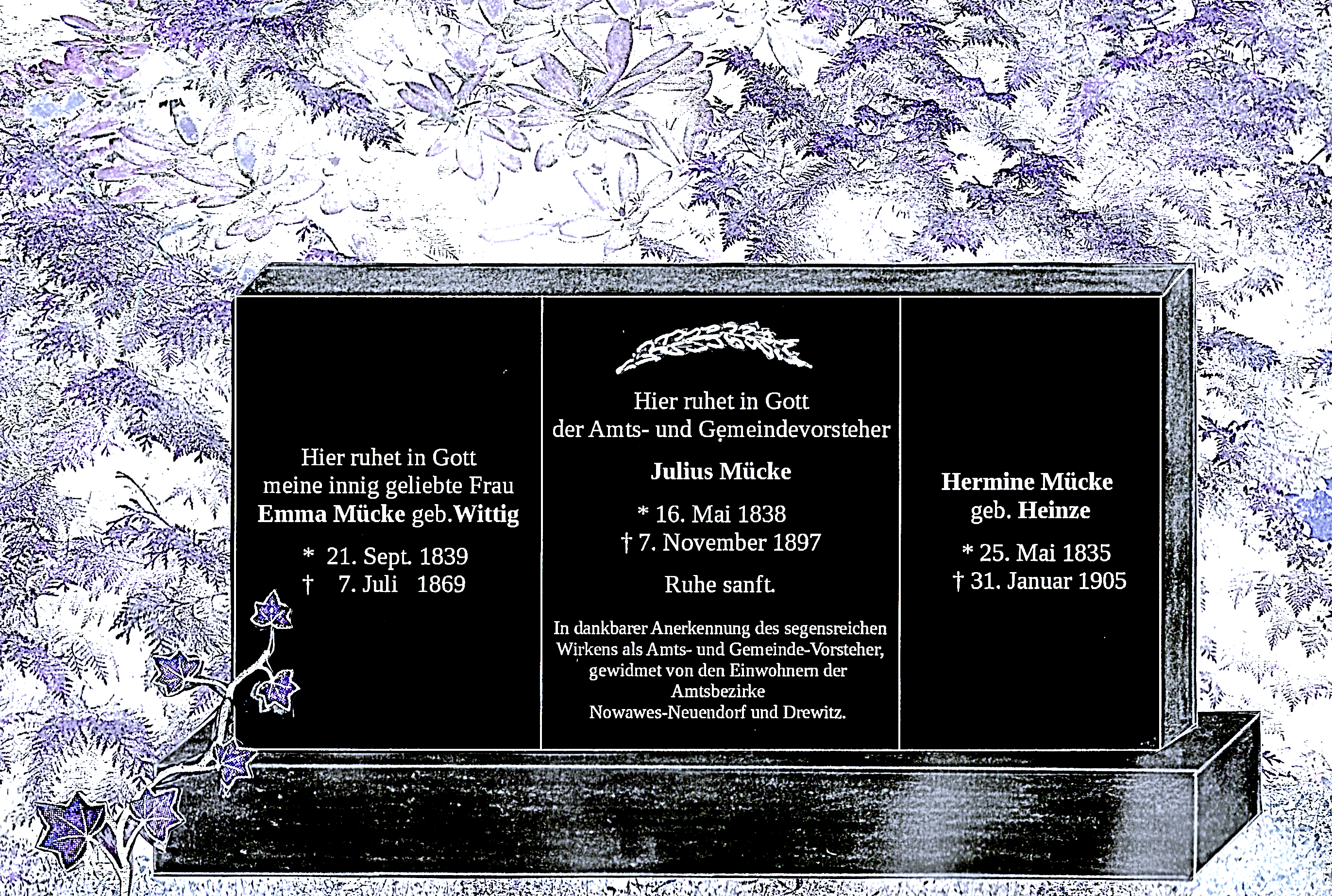 Auf dem Papier nachgestalter Gedenkort für Julius Mücke. Der Grabstein steht nicht mehr. Er bestand aus schwarzem Marmor, auf einem Sockel aus Granit. Die gravierten Buchstaben waren in Gold ausgeführt.
