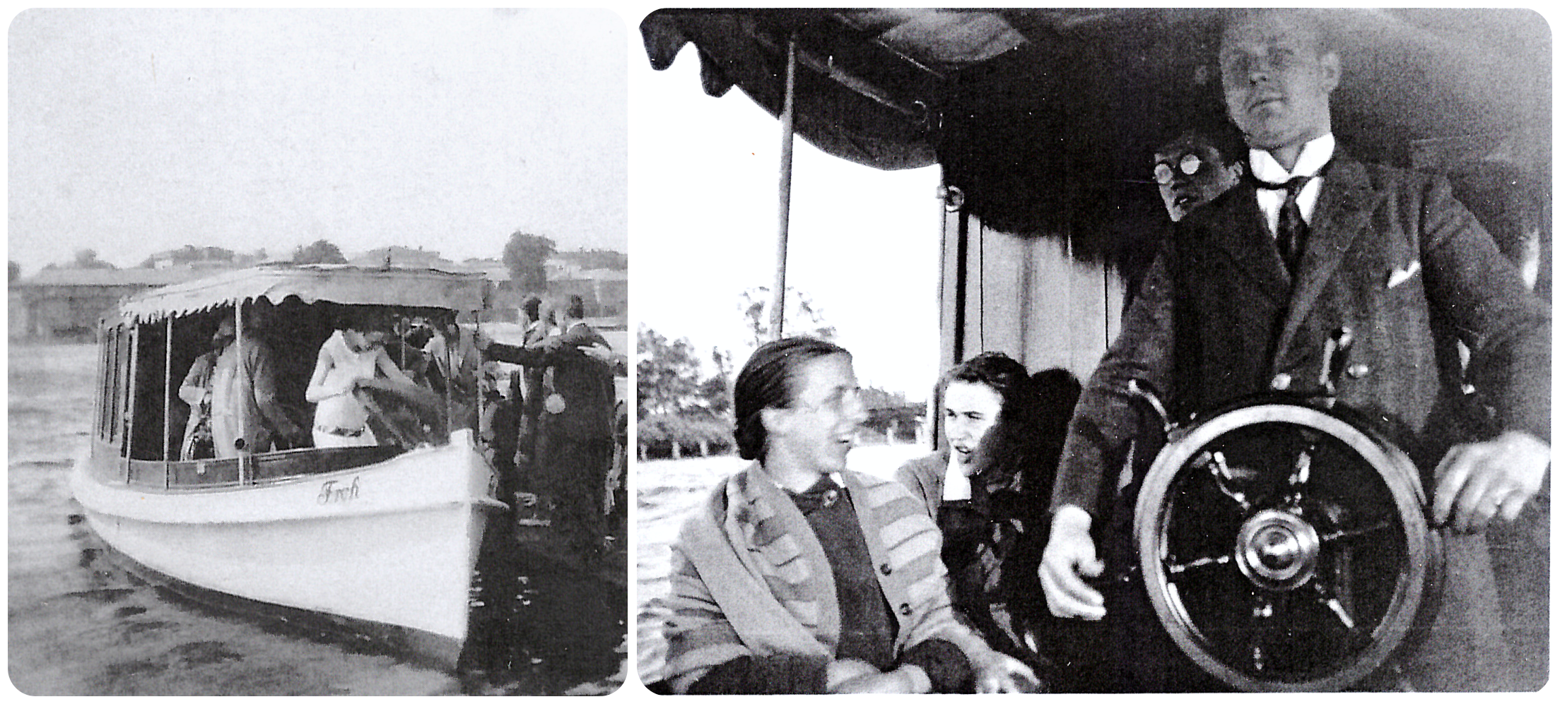 Fröhliche Ausflugsfahrt mit dem Motorschiff „Froh“ im Juli 1929. Hier an der Anlegestelle (Hapke / Ehm) nahe dem Havelhaus am Park. Auf dem rechten Bild vorne: Emma Hönow, die später Renn heißen wird.