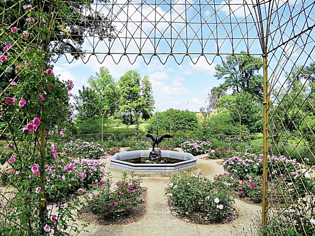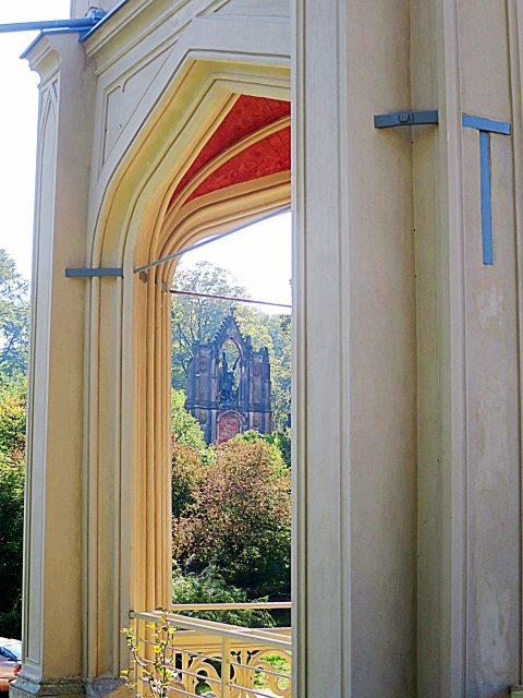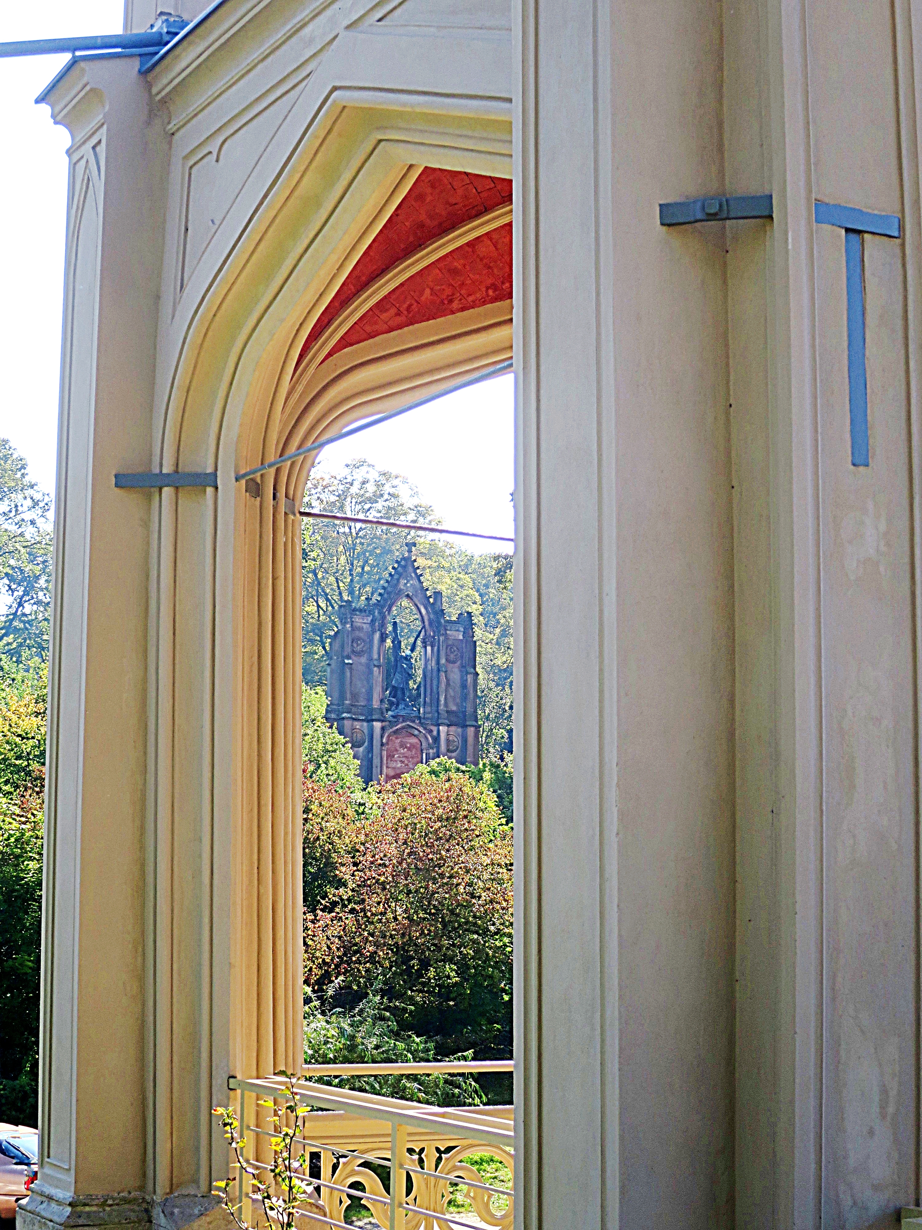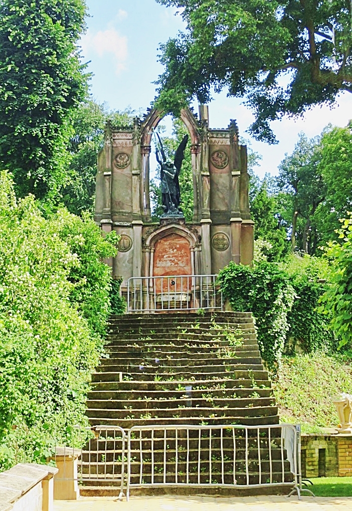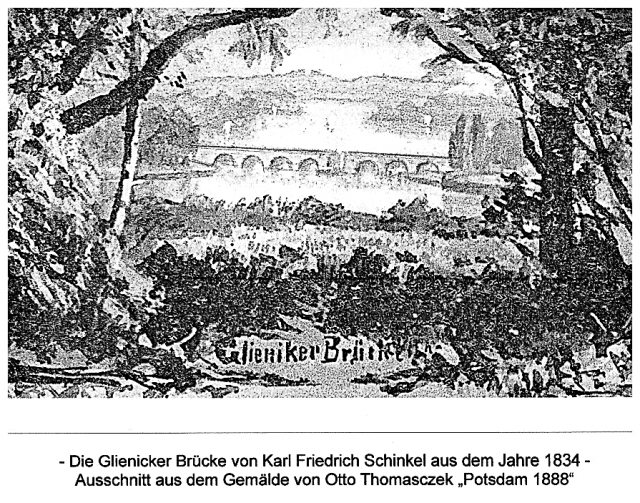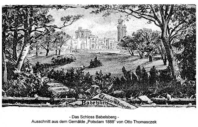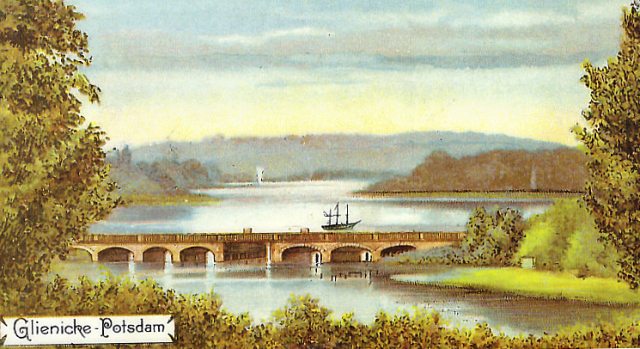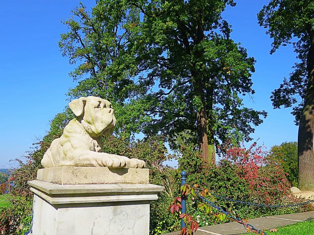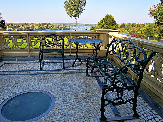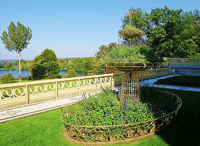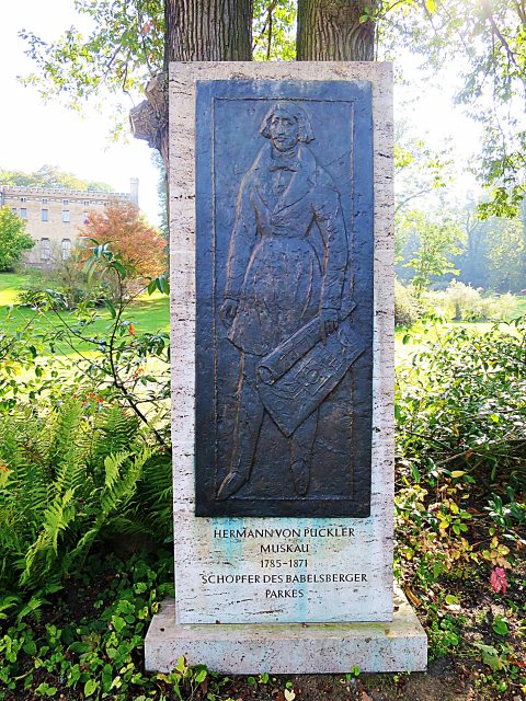 Ein Blick aus dem Schloss über die goldene Terrasse, über das Bowlinggreen mit Pappel bis zur Glienicker Brücke (in dieser Form 1907 gebaut).Das Wirtschaftsgebäude, auch Wohnstätte für Bedienstete, wird als Schlossküche bezeichnet. Das Haus ist mit dem Schloss durch einen unterirdischen Gang verbunden.Der Zugang zur Anlage der Schlossküche.ZugangsseiteAuf dem Weg zum Schloss.Voltaire-TerrasseVor der Porzellanterrasse.Der Brunnen, ein Geschenk der Dombauhütte und der Stadt Köln, etwa 1863.Hunde bewachen das Schloss.… und dieser ist für die Porzellanterrasse zuständig.Die blaue Terrasse.Die goldene Terrasse mit Blumenfontäne.Die Deckenwölbung über dem Teesalon.Ein zeitlicher Rückblick. Die Glienicker Brücke in ihrer Gestalt von 1834 bis 1906, von Karl Friedrich Schinkel konstruiert.Die Hinteransicht des Schlosses. Am Ende (rechts) der von Lindenbäumchen gesäumten Voltaire-Terrasse steht das Denkmal „Michael tötet den Drachen“.Das Denkmal. Inzwischen steht auf der Terrasse auch wieder der Jubiläumsbrunnen, 1854 – zum Andenken an die Silberhochzeit des Prinzen Wilhelm und der Prinzessin Augusta.Wir entfernen uns etwas von diesem Ort.Im Pleasureground begegnen wir im Goldenen Rosengarten dem wasserspeienden Reiher.Der ReiherbrunnenEine der herrlichen Blumenrabatten.Blumenschmuck – wohin das Auge schaut.Die Stele zum Gedenken an den Landschaftsgestalter Fürst Hermann Pückler-Muskau