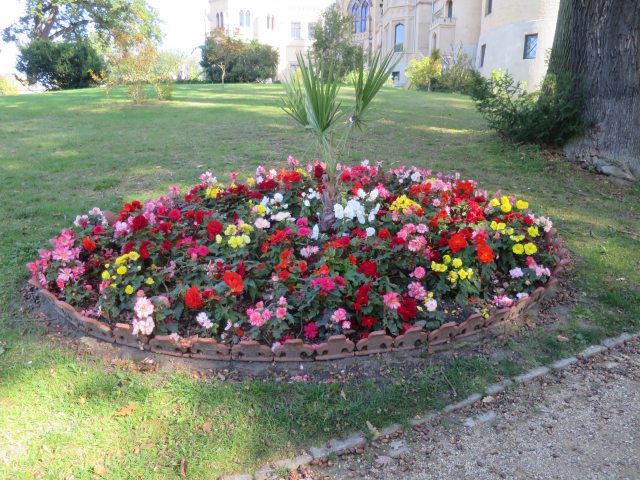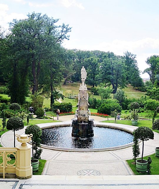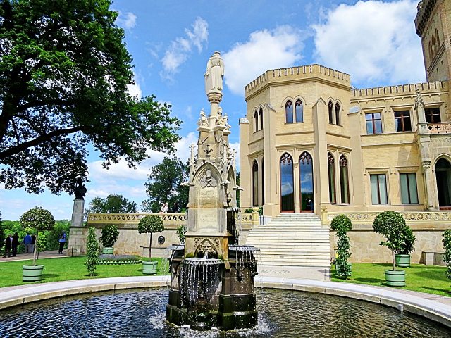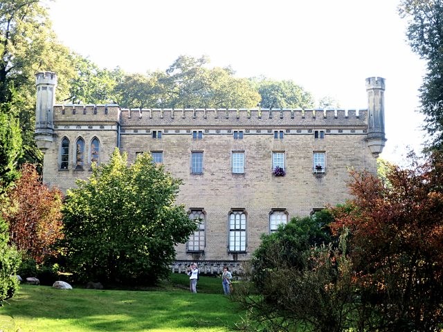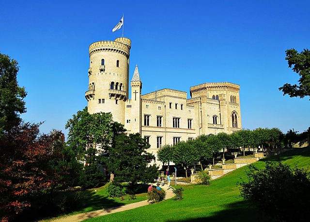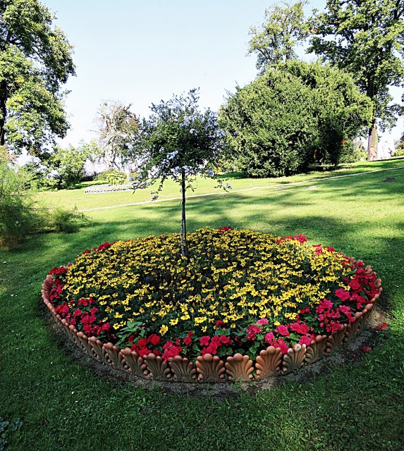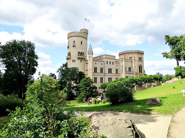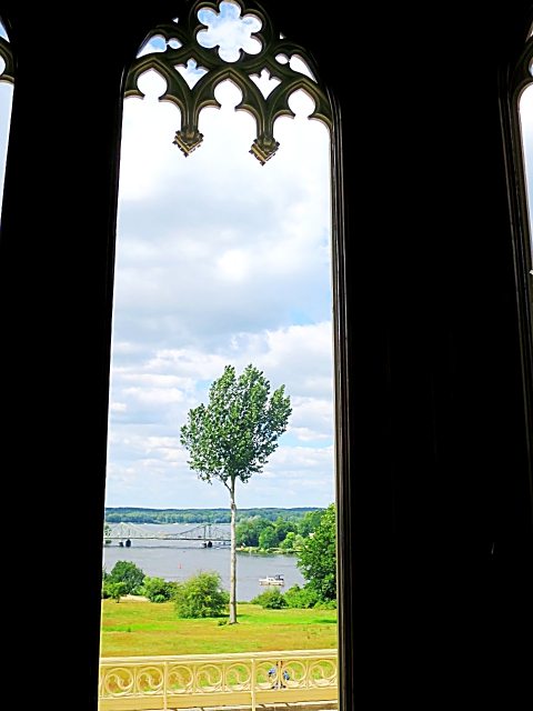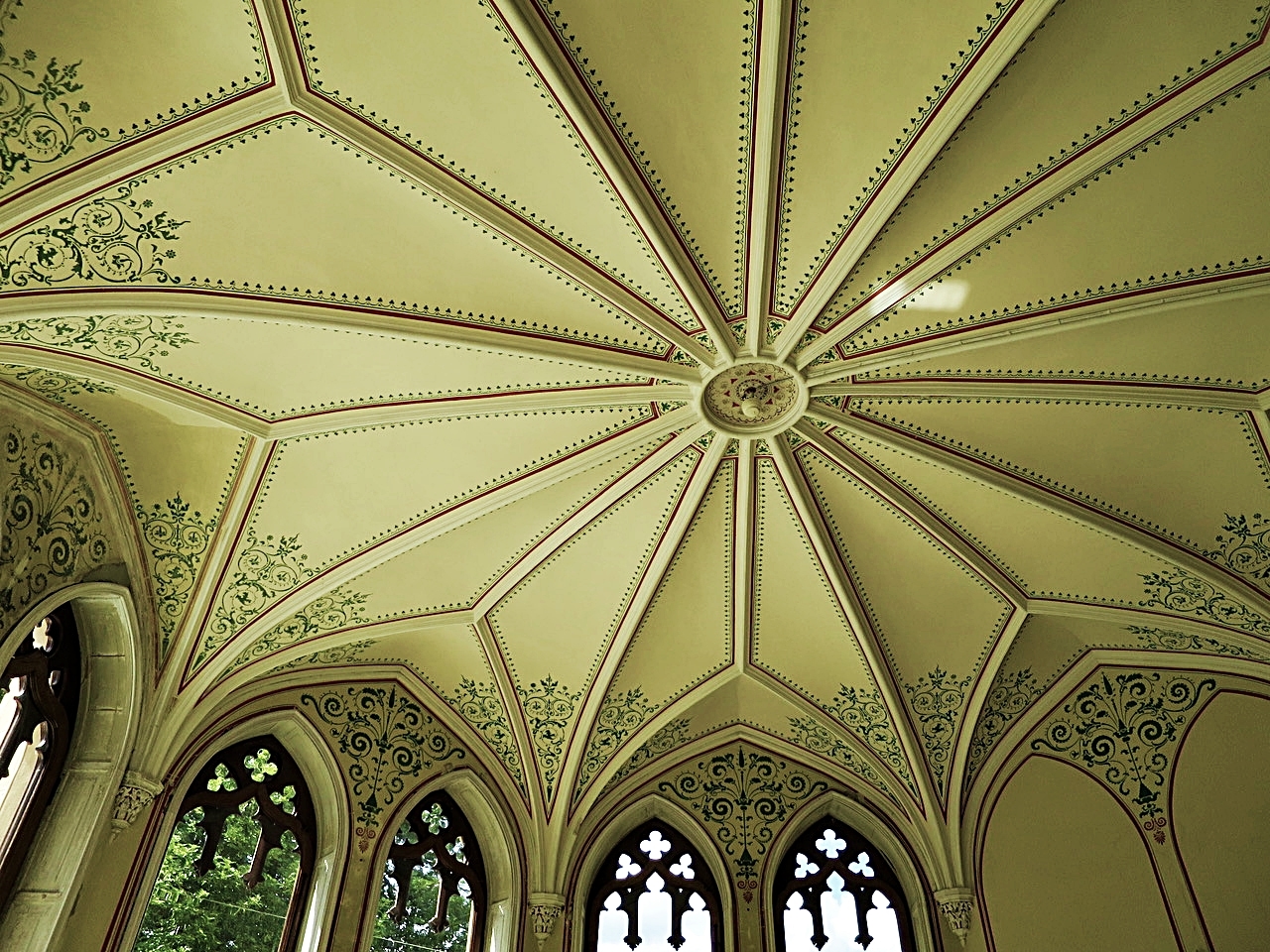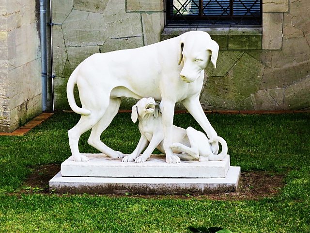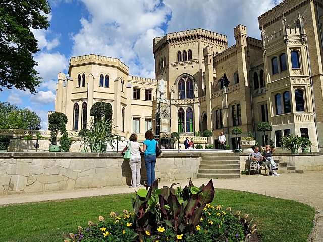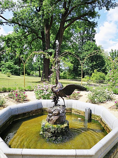 Ein Blick aus dem Schloss über die goldene Terrasse, über das Bowlinggreen mit Pappel bis zur Glienicker Brücke (in dieser Form 1907 gebaut).Das Wirtschaftsgebäude, auch Wohnstätte für Bedienstete, wird als Schlossküche bezeichnet. Das Haus ist mit dem Schloss durch einen unterirdischen Gang verbunden.Der Zugang zur Anlage der Schlossküche.ZugangsseiteAuf dem Weg zum Schloss.Voltaire-TerrasseVor der Porzellanterrasse.Der Brunnen, ein Geschenk der Dombauhütte und der Stadt Köln, etwa 1863.Hunde bewachen das Schloss.… und dieser ist für die Porzellanterrasse zuständig.Die blaue Terrasse.Die goldene Terrasse mit Blumenfontäne.Die Deckenwölbung über dem Teesalon.Ein zeitlicher Rückblick. Die Glienicker Brücke in ihrer Gestalt von 1834 bis 1906, von Karl Friedrich Schinkel konstruiert.Die Hinteransicht des Schlosses. Am Ende (rechts) der von Lindenbäumchen gesäumten Voltaire-Terrasse steht das Denkmal „Michael tötet den Drachen“.Das Denkmal. Inzwischen steht auf der Terrasse auch wieder der Jubiläumsbrunnen, 1854 – zum Andenken an die Silberhochzeit des Prinzen Wilhelm und der Prinzessin Augusta.Wir entfernen uns etwas von diesem Ort.Im Pleasureground begegnen wir im Goldenen Rosengarten dem wasserspeienden Reiher.Der ReiherbrunnenEine der herrlichen Blumenrabatten.Blumenschmuck – wohin das Auge schaut.Die Stele zum Gedenken an den Landschaftsgestalter Fürst Hermann Pückler-Muskau