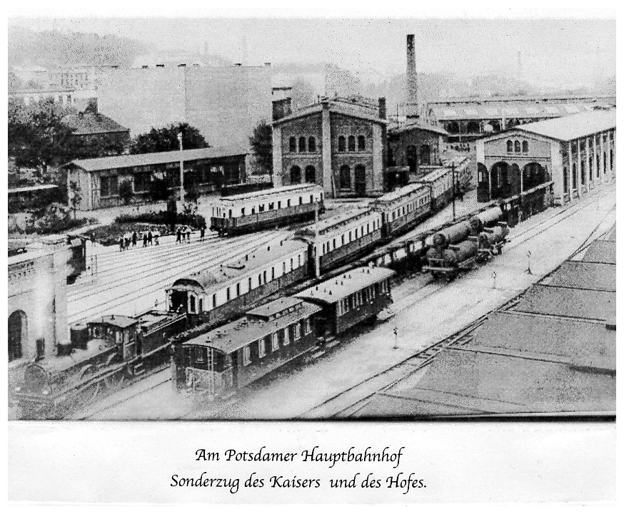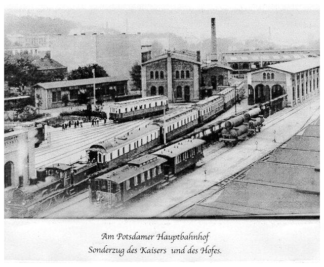 Ausfahrt des Sonderzuges von Kaiser Wilhelm II. (am Potsdamer Hauptbahnhof) in Richtung des Kaiserbahnhofs Potsdam-Wildpark, nahe >Neues Palais<.