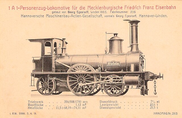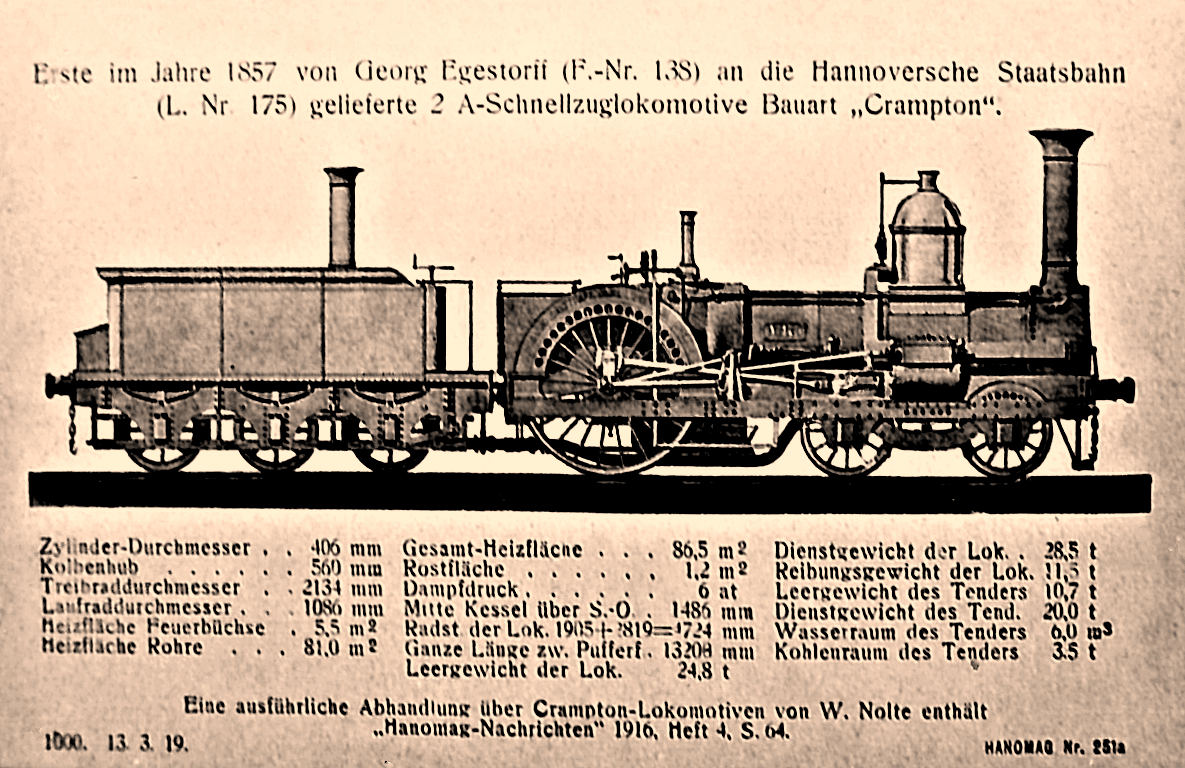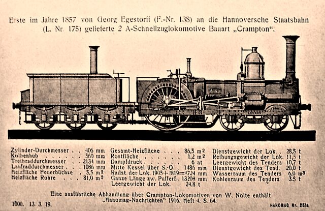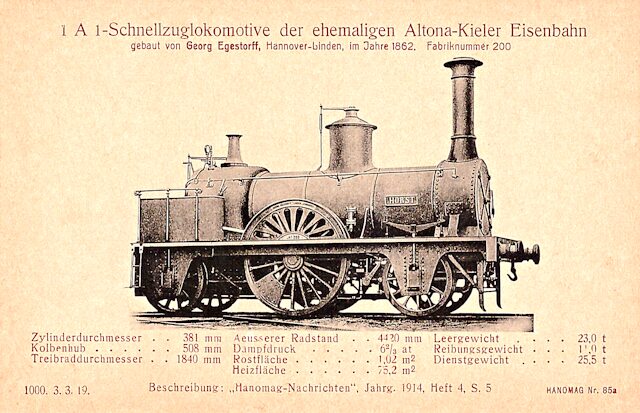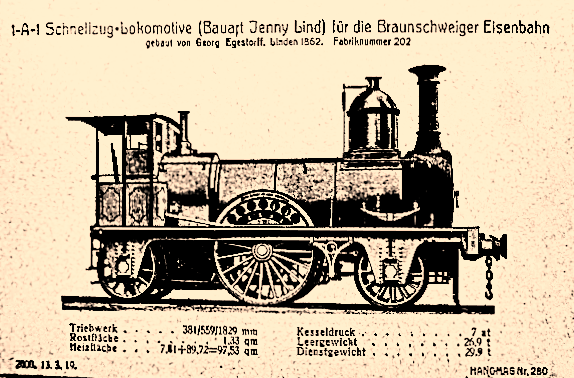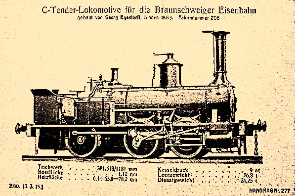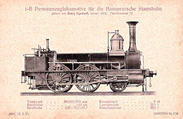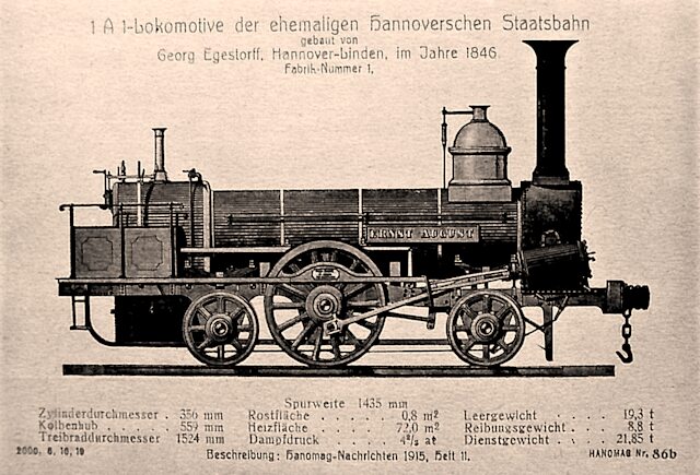Es folgen hier einige Lokomotiven aus der 1835 gegründeten Hannoverschen Maschinenfabrik von Georg Egestorff, in Hannover-Linden beheimatet. Seit 1846 wurden dort auch Lokomotiven gebaut. Im folgenden Bild sehen wir die erste Lokomotive des Betriebes. Reichlich 10.500 Maschinen werden allein diese Fabrik verlassen und in vielen Ländern eingesetzt werden.