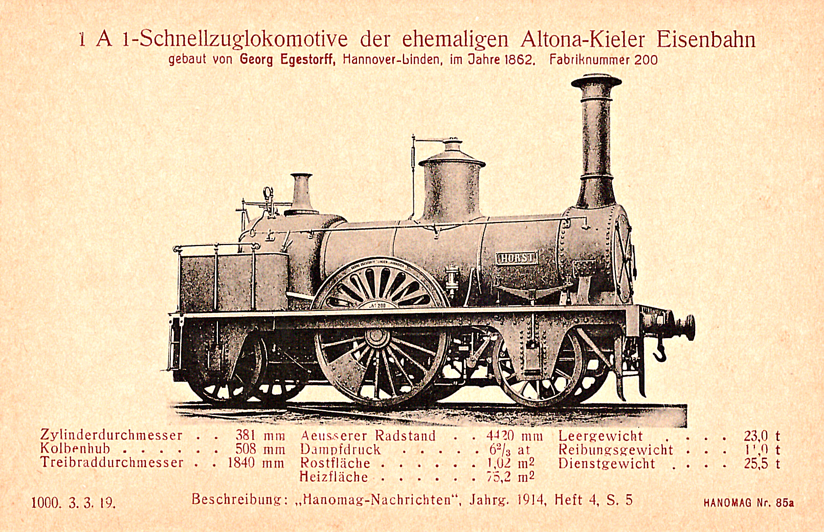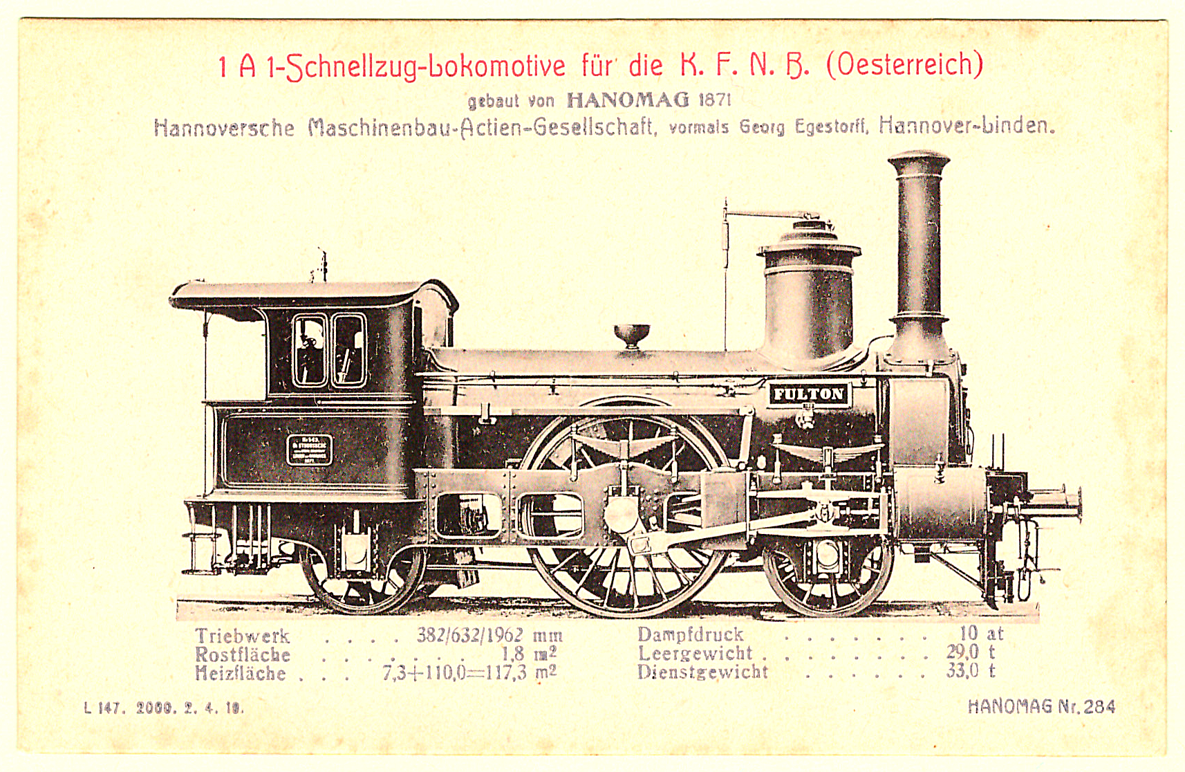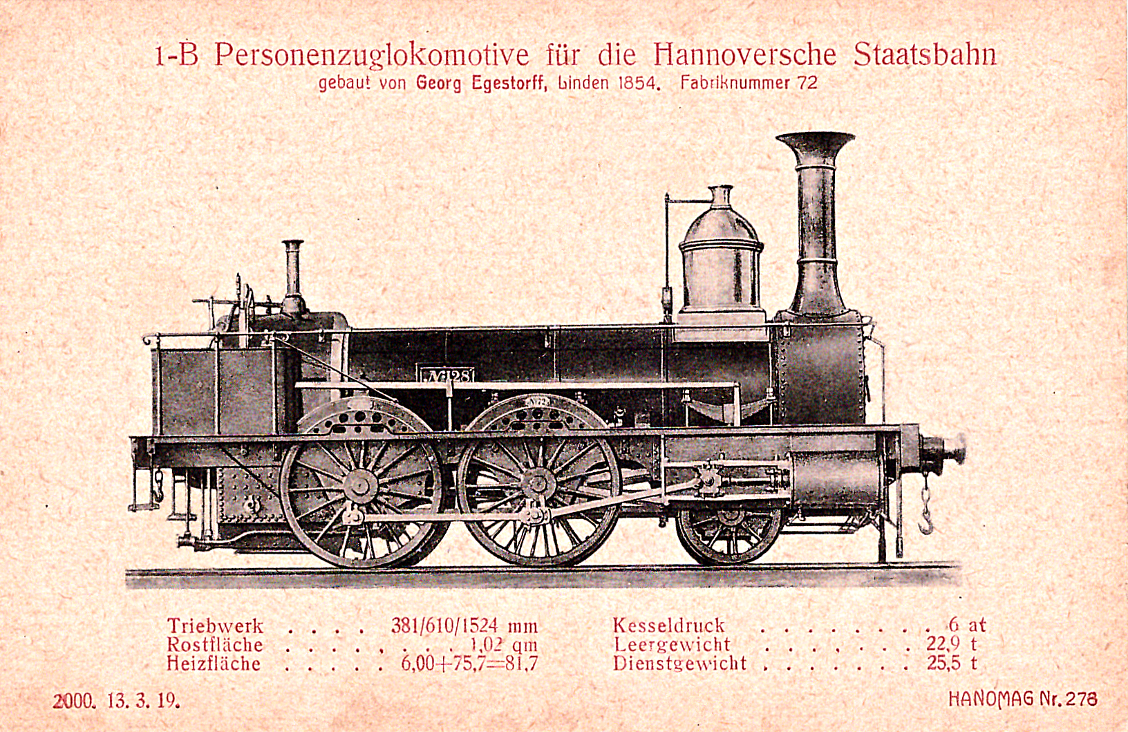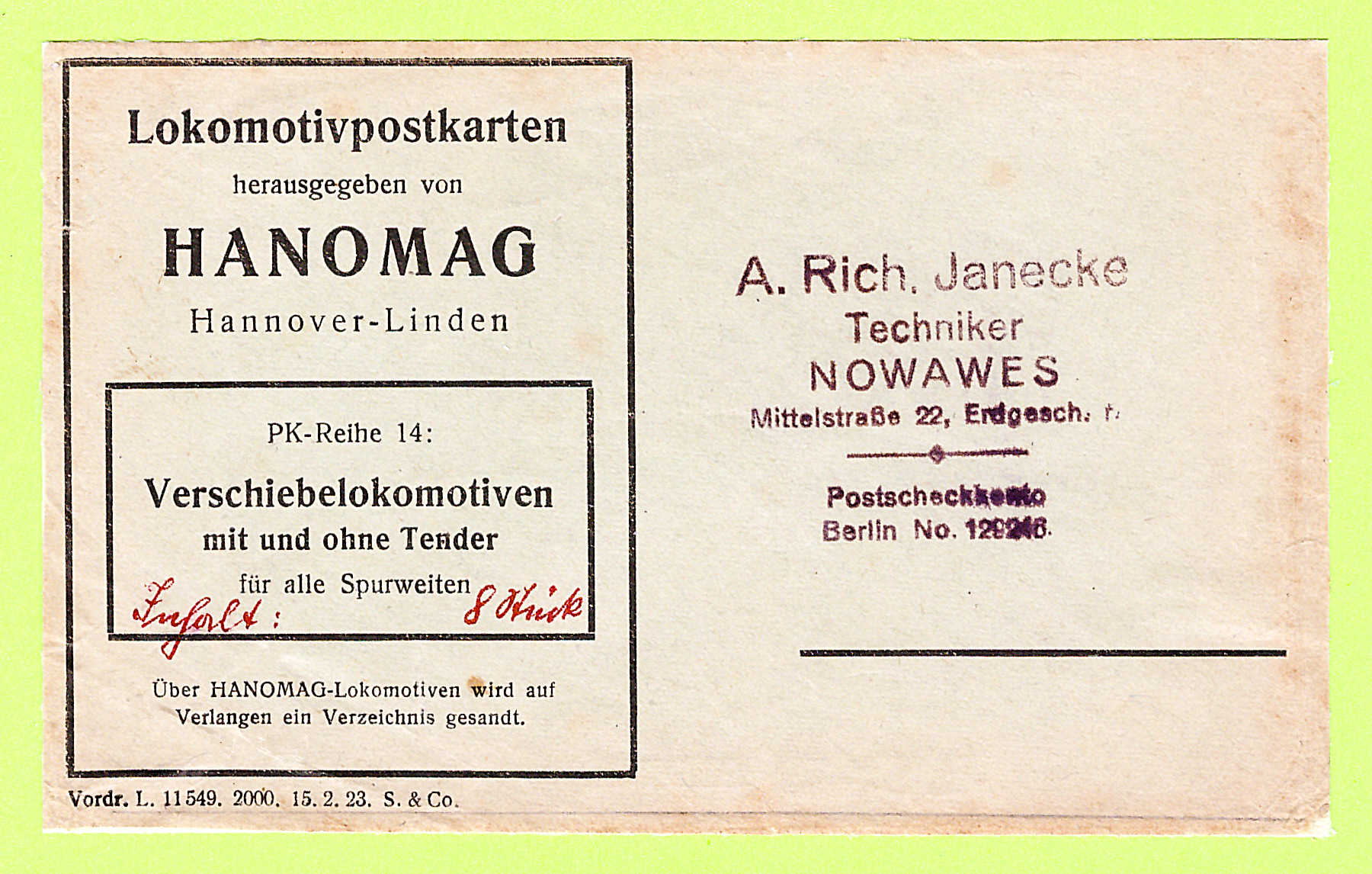 Die nun folgenden sechs farbigen hochwertigen Lokomotivdarstellungen wurden im Auftrag der Lokomotivbaufirma Hanomag, vom Künstler Herrn Teuteberg, gezeichnet und coloriert. Der Farbdruck erfolgte in der Geschäftsbücherfabrik >Edler Krische< in Hannover.