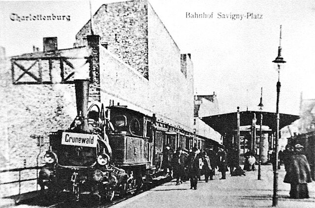 ... vom Berliner Zentrum nach Grunewald. Halt im Bahnhof Savignyplatz (im Berliner Stadtbezirk Charlottenburg). Quelle: Handelsübliche Ansichtskarte.