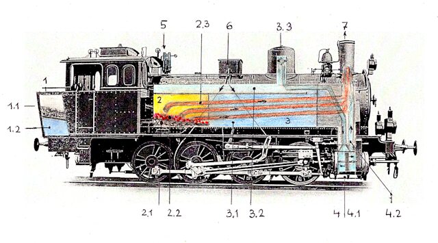 Die Hauptfunktionen: Die Steinkohleglut erhitzt die Luft im Feuerraum (2). Die rauchige Heißluft strömt durch durch das Bündel der eng gepackten Heizrohre (2.3). Die erhitzten Rohre geben im Wasserkessel (3) die Wärme an das Wasser ab. Erreicht das Wasser die Siedetemperatur, geht das heiße Wasser in Dampf über. Der Dampf sammelt sich an höchster Stelle, im Dampfdom. Vom Dampfdom führt eine Dampfrohrleitung hinunter zum Zylinder mit Kolben. Der Dampf wird in schneller Folge wechselnd vor und hinter dem Kolben in den Zylinder geblasen. Der komprimierte Dampf entspannt sich im Zylinder und bewegt mit diesem Ausdehnen den Kolben, der die Bewegung auf die Pleuelstange überträgt und jene wirkt wiederum auf das Treibrad. – Der Rauch aus dem Feuerraum, wie auch der Restdampf aus dem Zylinder, verlassen die Maschine durch den Auspuff / Schlot ... und es bleibt noch ausreichend Energie für die benachbarte Dampf-Pfeife.