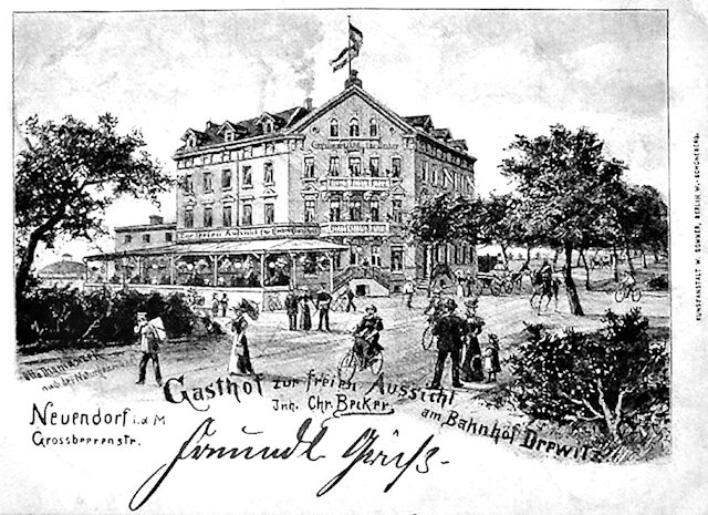 Der herrliche Gasthof mit vielen ruhigen Außenplätzen befand sich in Neuendorf (=> Nowawes, => Potsdam-Babelsberg) auf dem Grundstück: Großbeerenstraße, Ecke Wetzlarer Straße. Im Bild zweigt nach rechts die Böckmannstraße ab (=> August-Bebel-Straße). Im Hintergrund, links, sehen wir wieder den Kuppelbau „Zirkus“, die zentrale Montagehalle der Lokomotivfabrik Orenstein & Koppel AG.