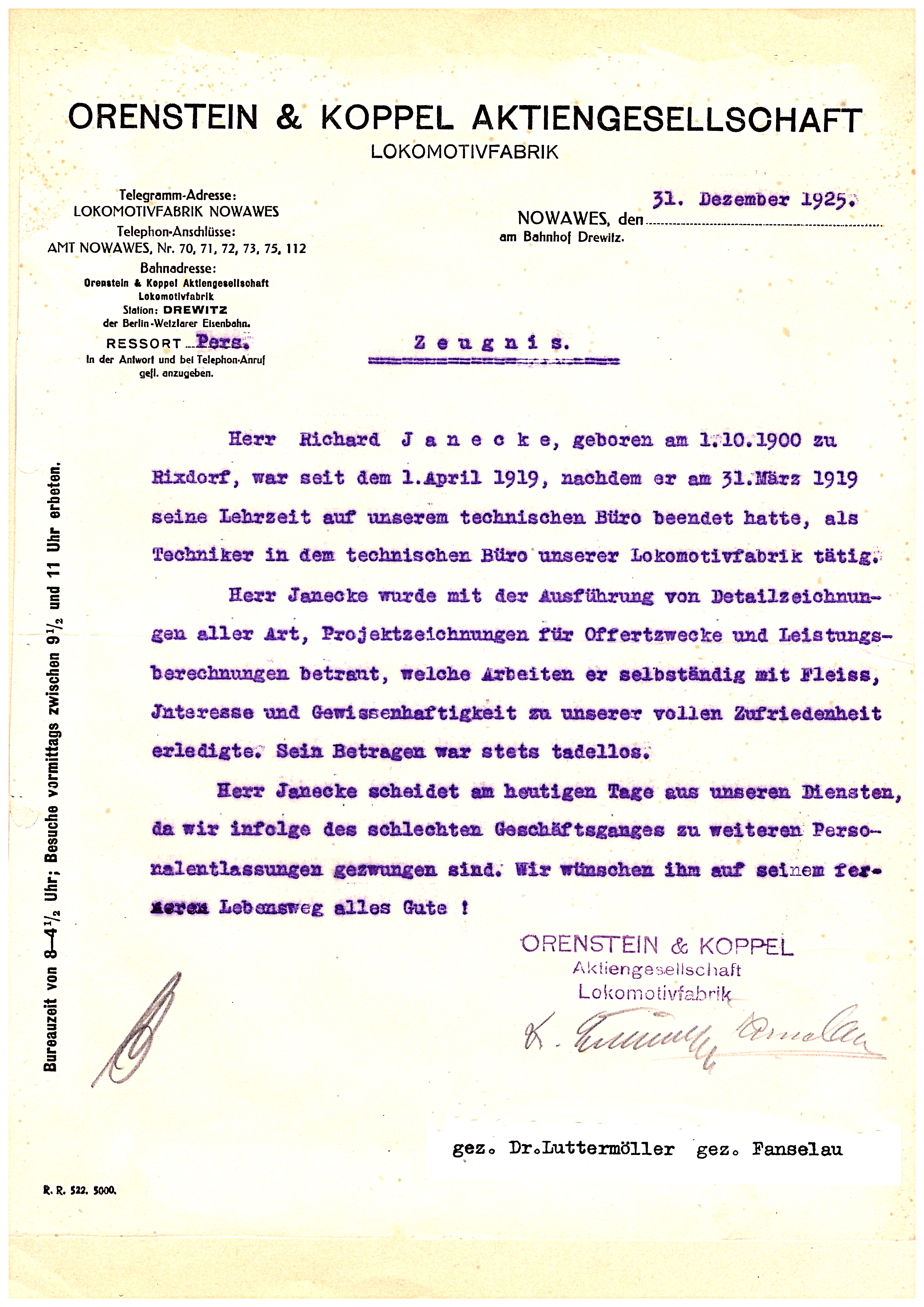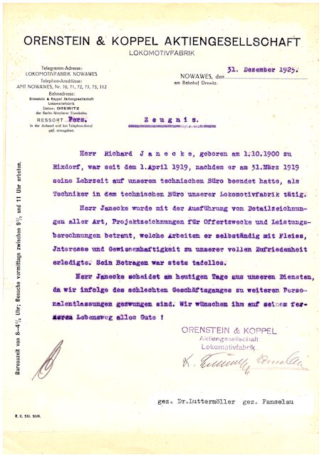 Das letzte Zeugnis für den Techniker Richard Janecke, in Nowawes bei Potsdam – nach einem Jahrzehnt der Betriebszugehörigkeit – in der Zeit zwischen Inflation und Weltwirtschaftskrise. So wird der 25-Jährige sehr bald ein eigenes Technisches Büro eröffnen ...