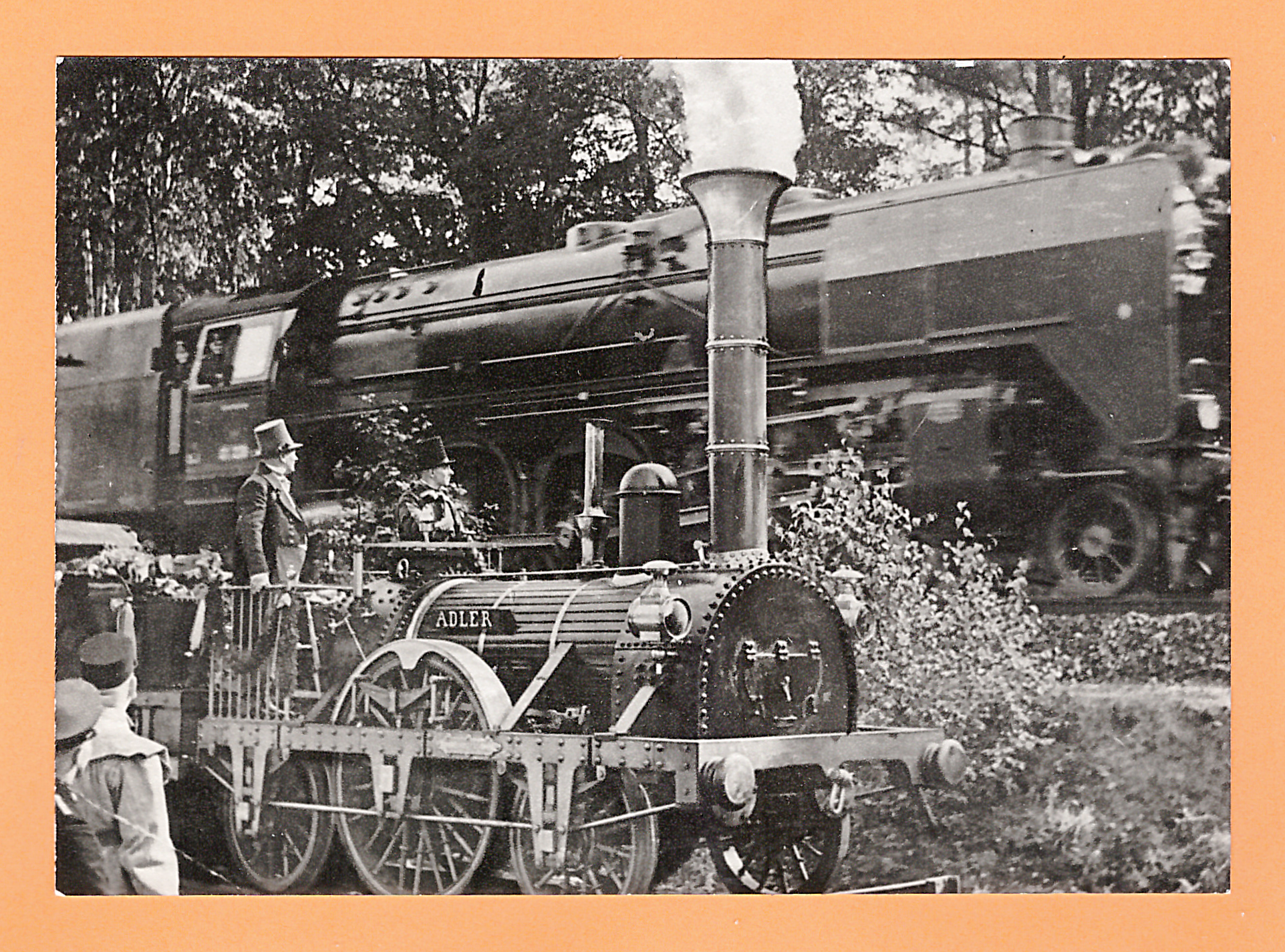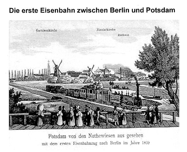 Die Bahn kommt (auf dem Bild) von Potsdam angedampft. Sie durchrollt hier ohne Halt die Neuendorf- / Nowaweser Gemarkung, um nach Berlin, Potsdamer Bahnhof, zu eilen. Hinter der Windmühle – die Potsdamer Hof- und Garnison-Kirche an der „Breite Straße“. Nach deren gut sichtbarer Turmuhr richtet sich die pünktliche Abfahrt der Eisenbahn. Vor den Zug gespannt ist die englische Import-Locomotion >Adler<. Auch die Maschine >Pegasus< ist hier im rollenden Einsatz zum Beginn des Eisenbahn-Zeitalters. Bald aber werden Lokomotiven aus deutscher Produktion eingesetzt – leistungsfähiger und preisgünstiger als die importierten Modelle – wie auch spektakuläre publikumswirksame und um Besteller werbende Wettfahrten beweisen!
