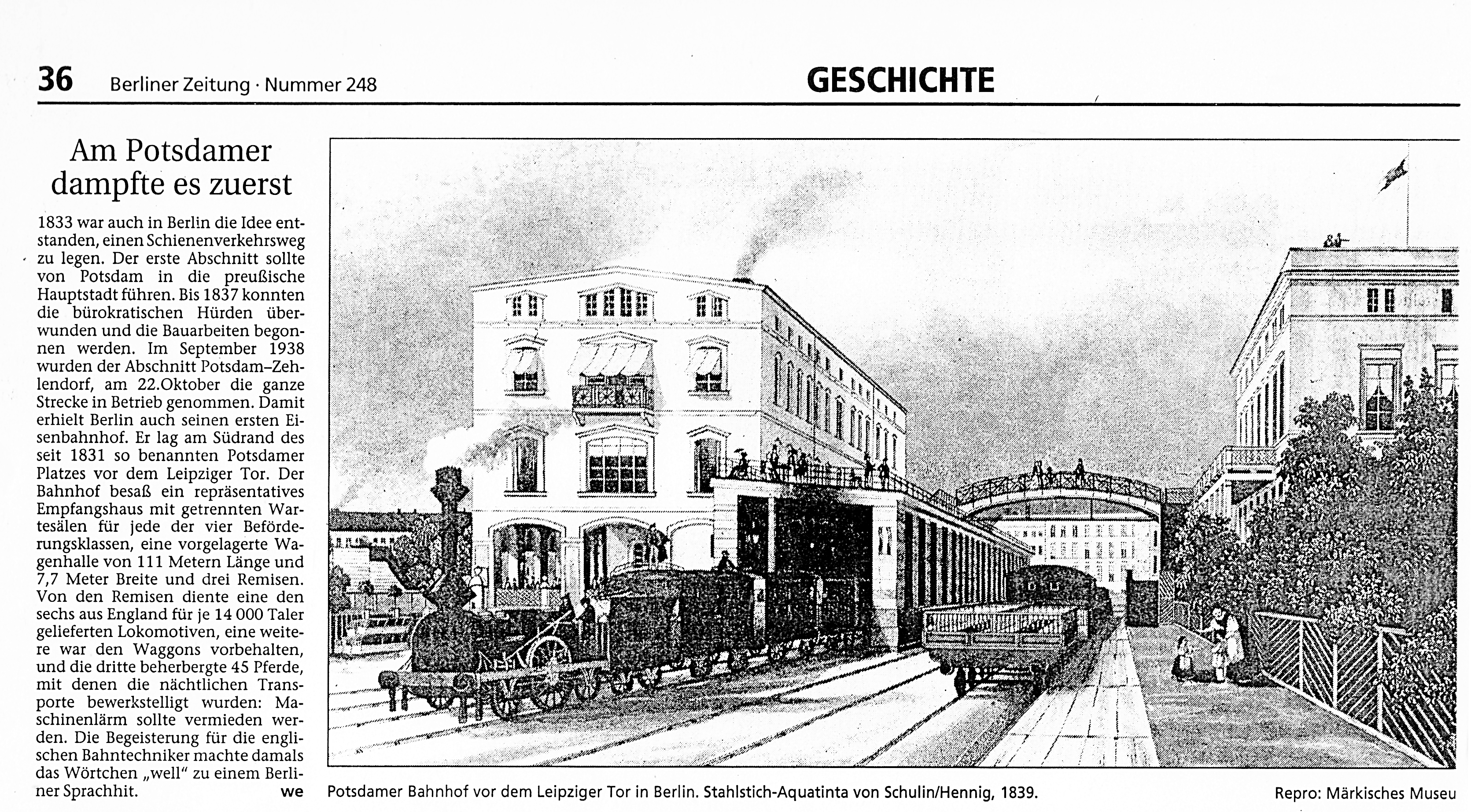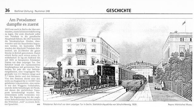 Es ist die dritte Bahnlinie im deutschen Staatenbund. Die erste führte durch Bayern, – nicht durch ganz Bayern aber immerhin etwa 6 km von Nürnberg nach Fürth. Die zweite Strecke verlief in Sachsen von Leipzig nach Dresden und nun die dritte, in Preußen, von Potsdam über Zehlendorf nach Berlin. Als Dritte ist sie auch gleichfalls die erste Preußische Eisenbahnstrecke und deshalb auch >die Stammbahn< genannt.