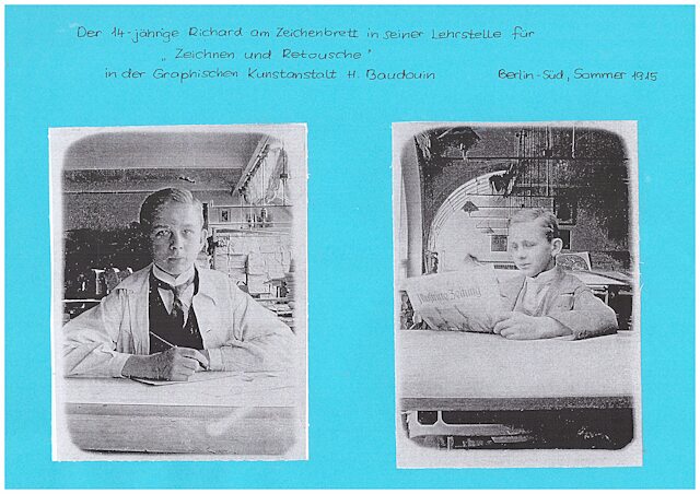 Bereits leider schon nach vier Monaten, im August 1915, endet für den 14-jährigen Richard diese intensive Ausbildungszeit, wegen des Wohnortwechels der Familie von Britz nach Nowawes => Potsdam-Babelsberg. Richard aber wird das Bemühen auf diesem Gebiet weiter betreiben und zwischen 1918 und 1920 auch an Weiterbildungs-Abendkursen, zumindest auf dem Gebiet der Schriftgestaltung, teilnehmen.