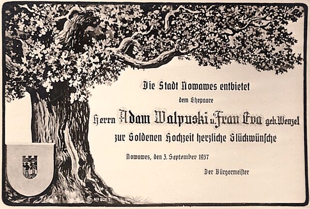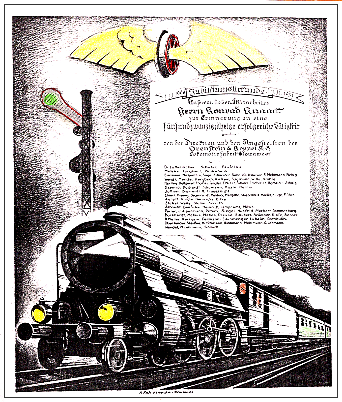 Von seiner ehemaligen Betriebsleitung erhält Richard den Auftrag für das Ausfertigen dieser Urkunde und weiterer Ehrungen. In der unteren Hälfte der Gratulation stehen die Namen der Gratulanten – ausgewählte leitende Mitarbeiter des Betriebes.