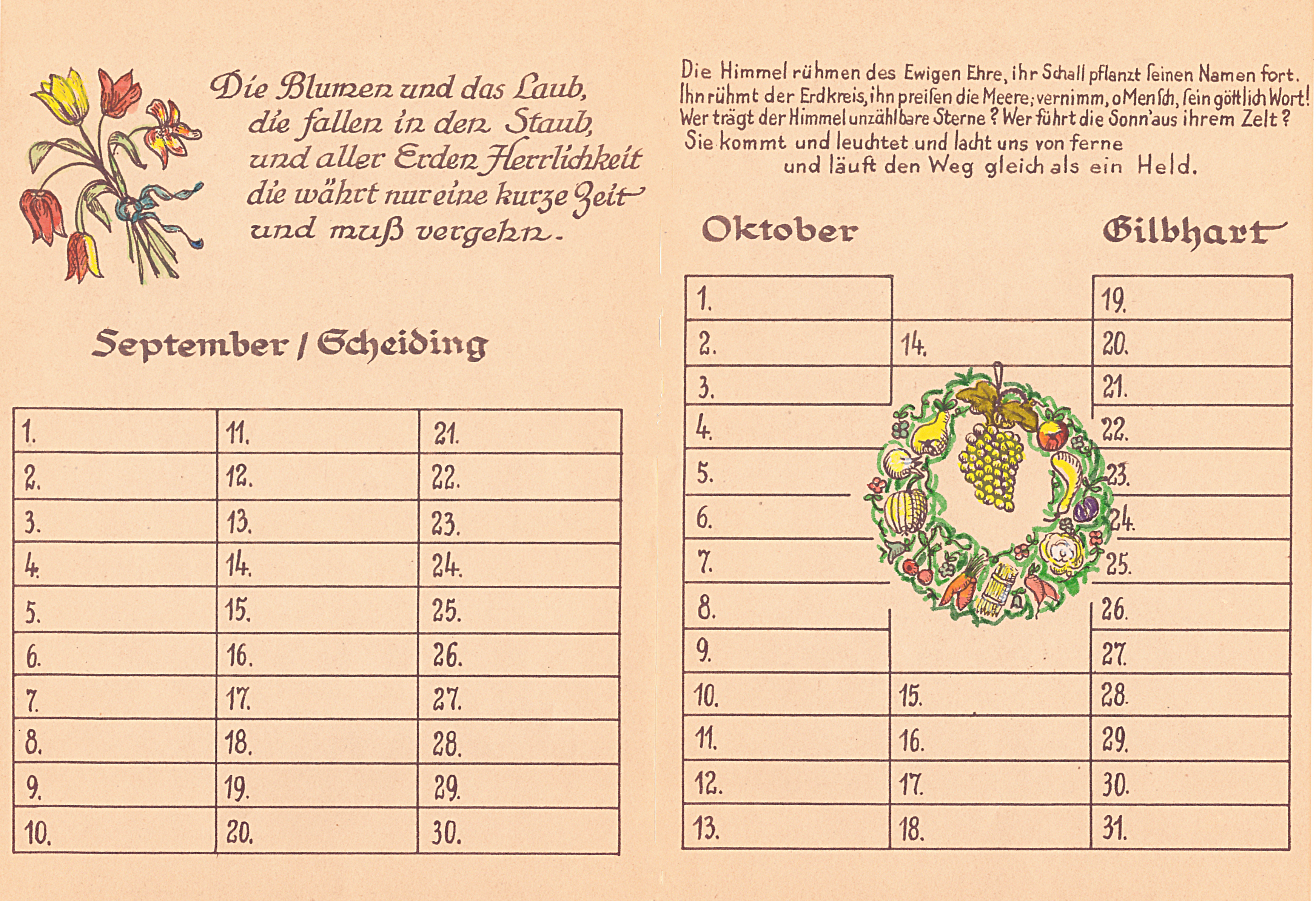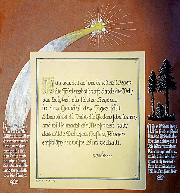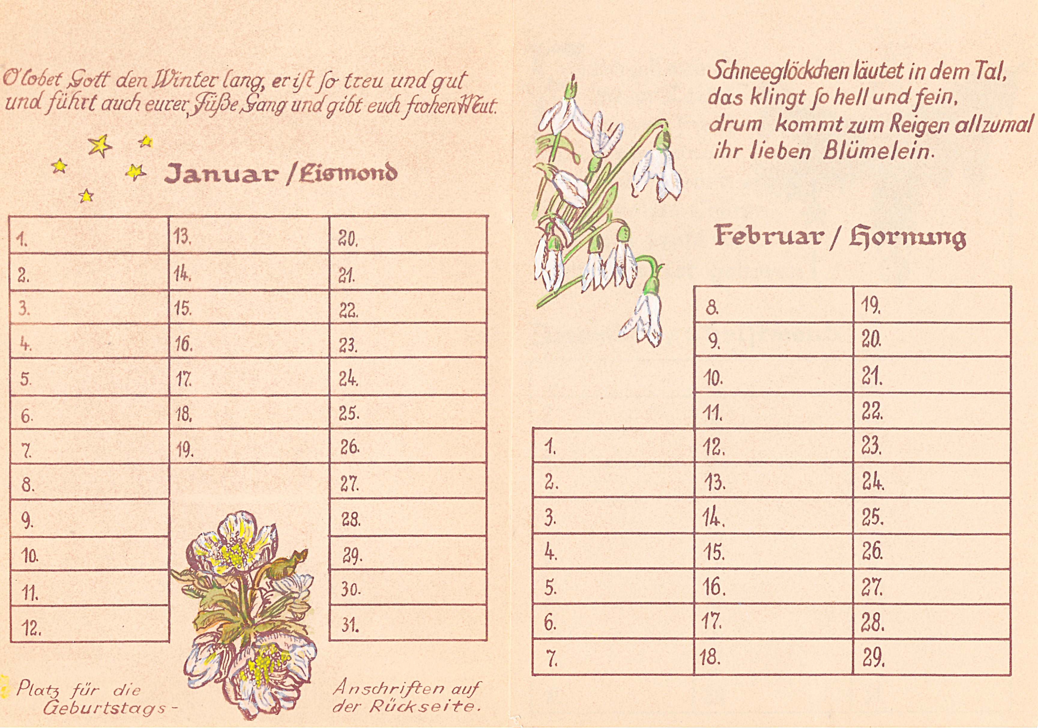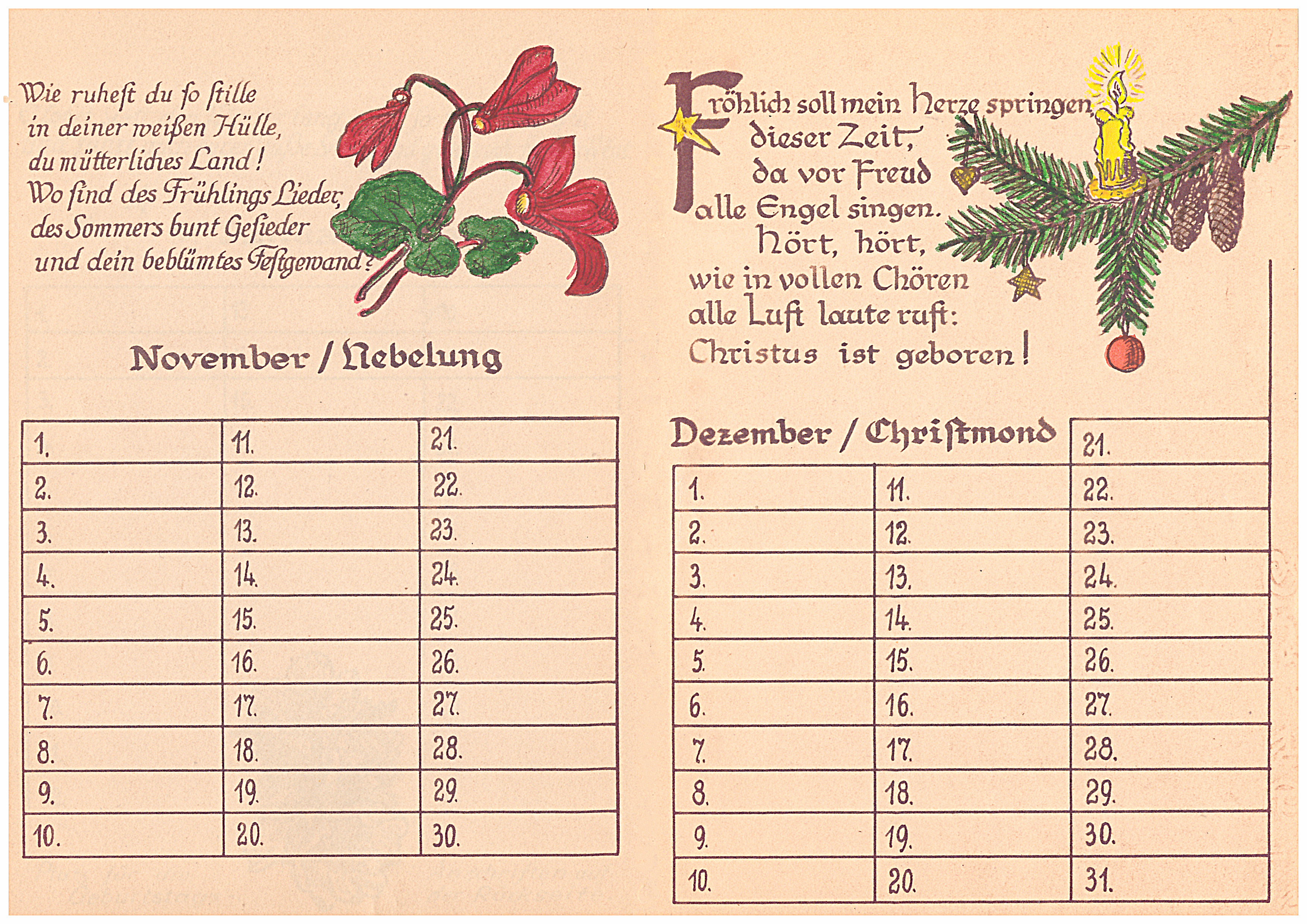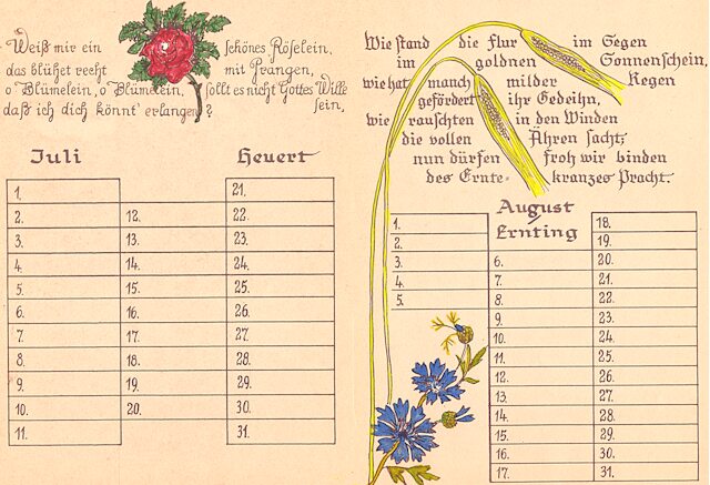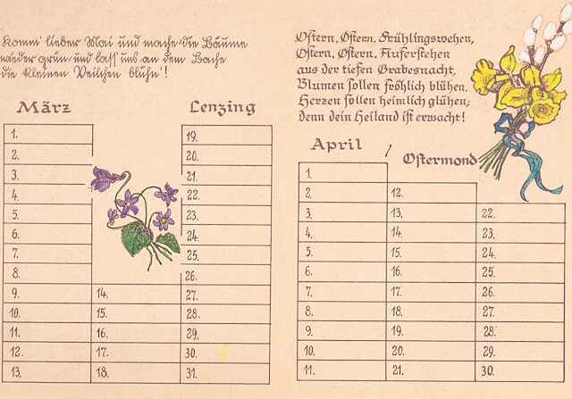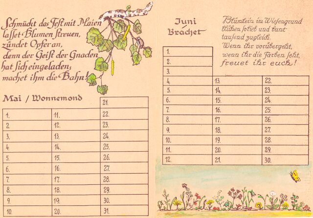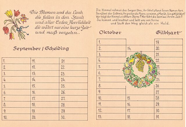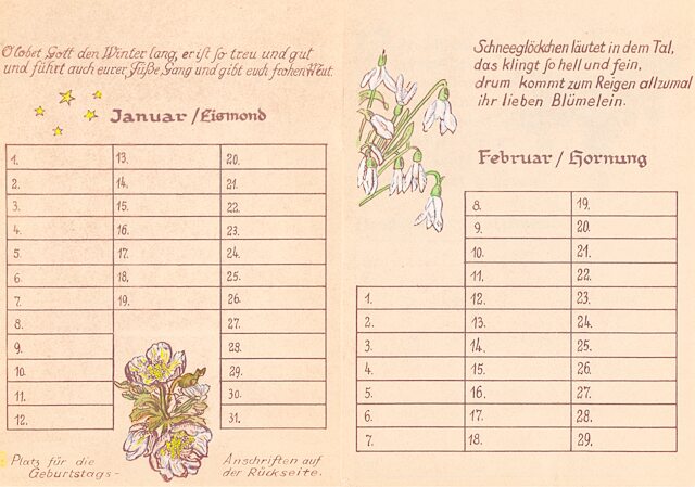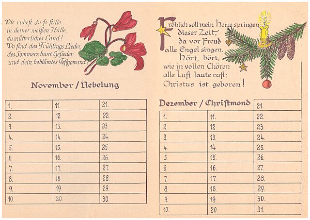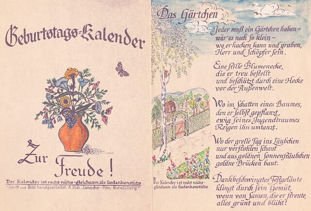 14 Blätter als Merkhilfe für besondere, teils wiederkehrende Fest- und Gedenktage, vorzugsweise für christliche Nutzer ausgerichtet. Schrift und Zeichnungen: Richard Janecke, koloriert von Ehefrau Anne-Marie Janecke, geborene Sommer. Es folgen hier die nächsten 12 Seiten: