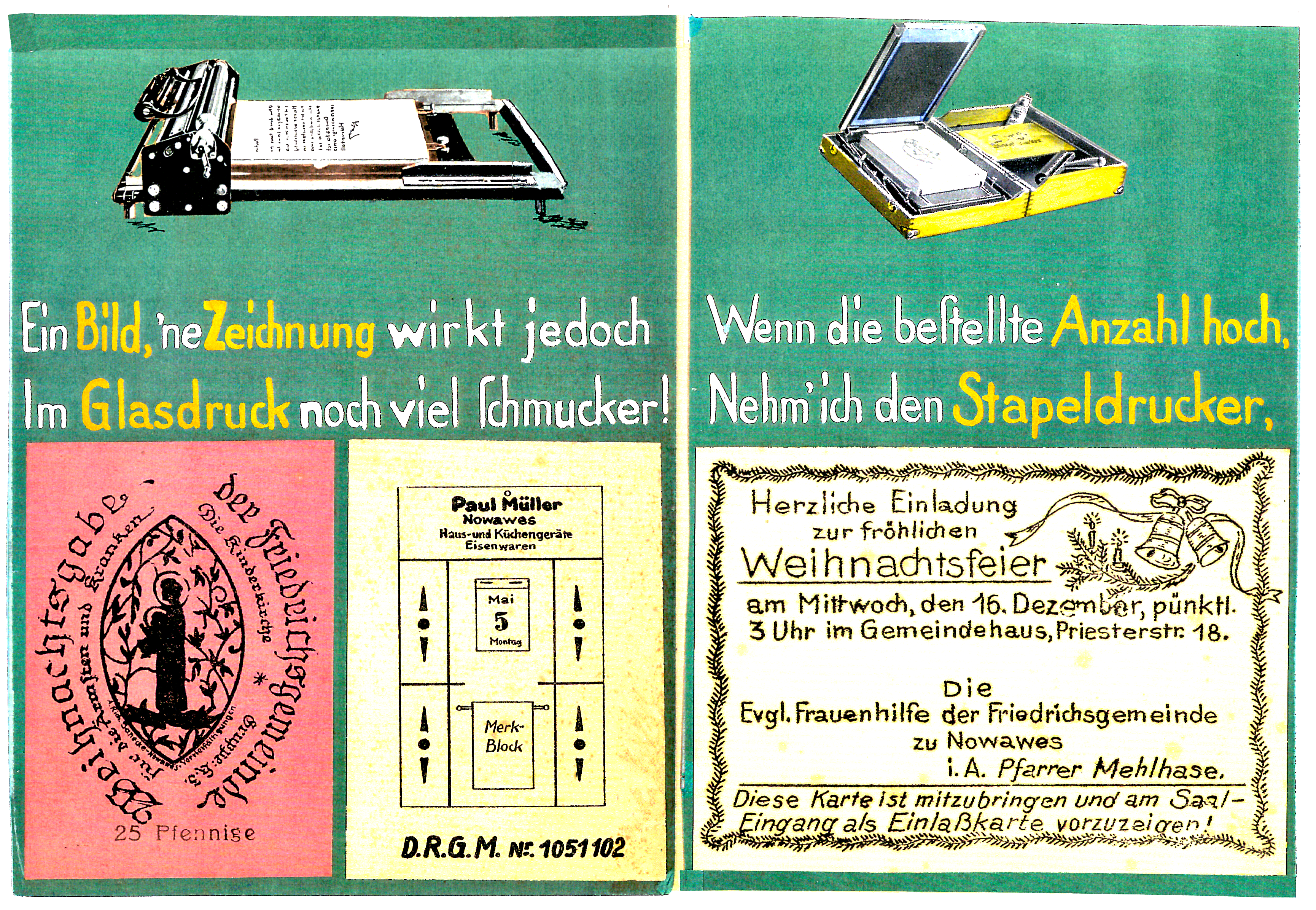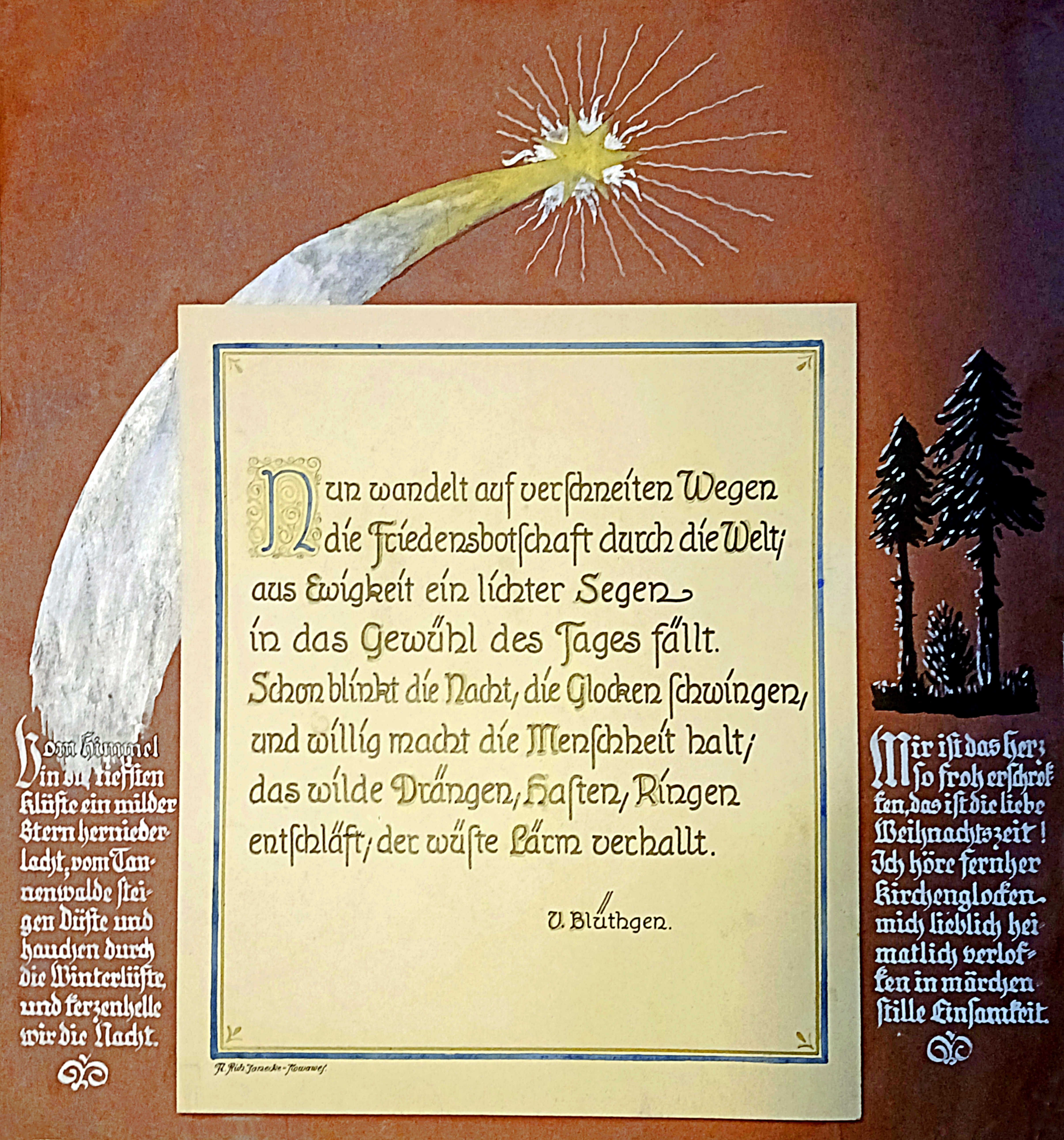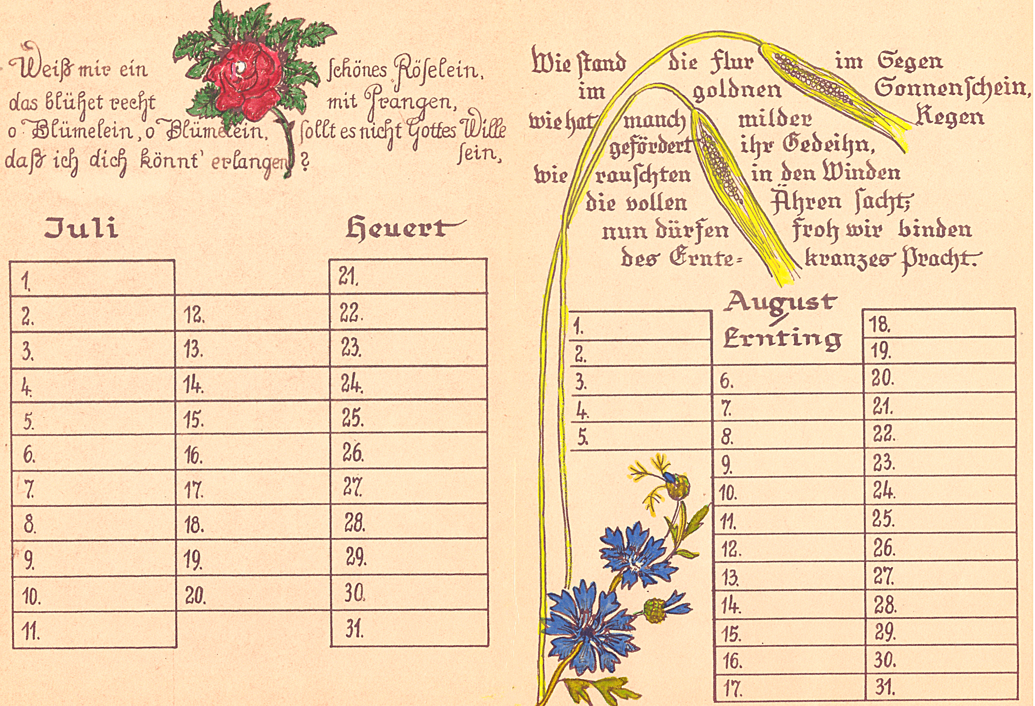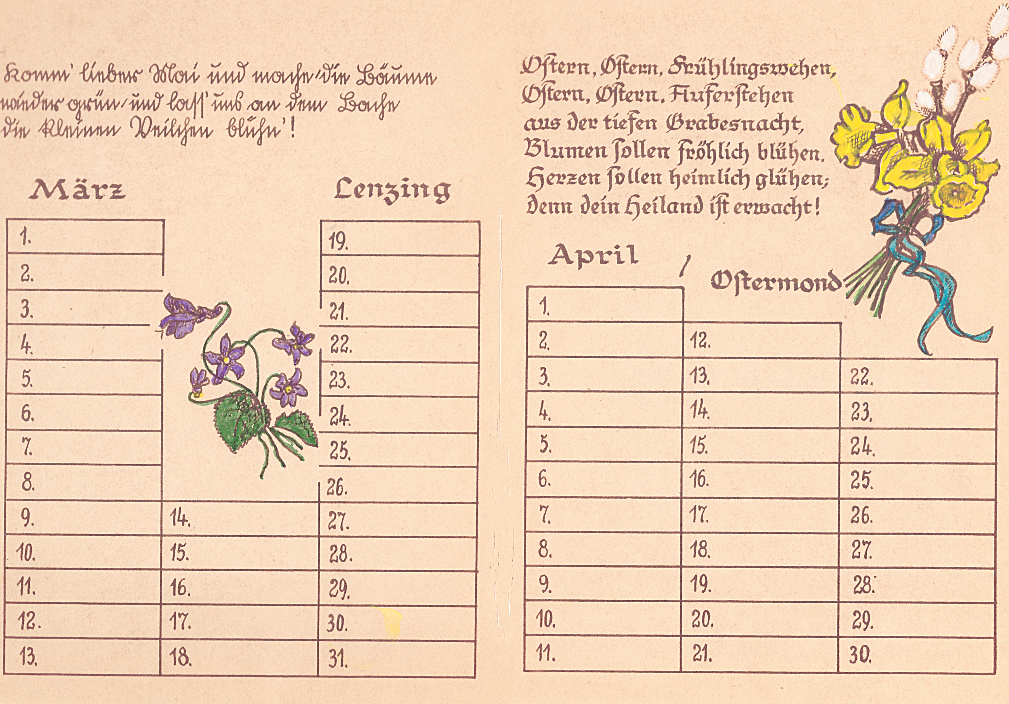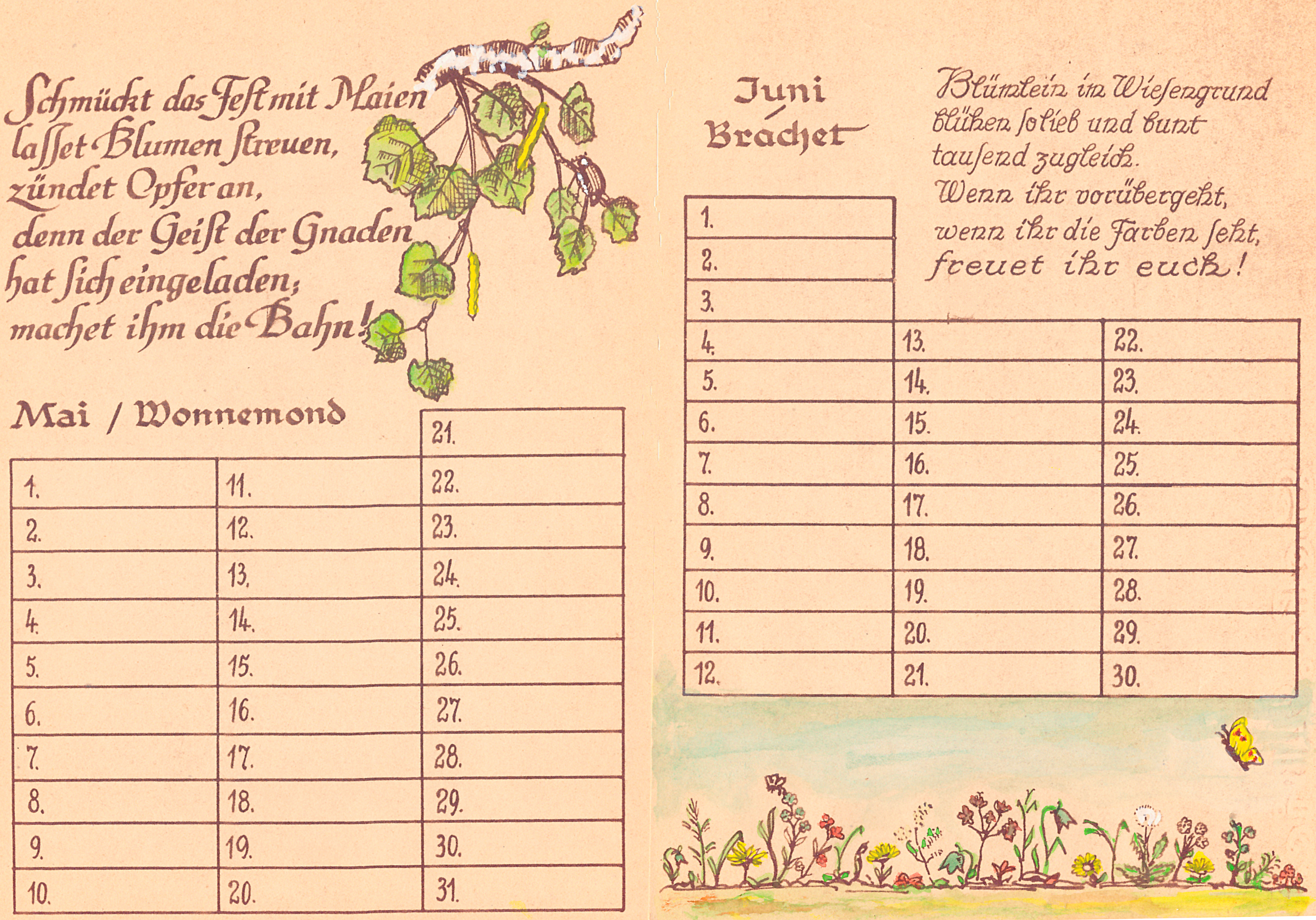 14 Blätter als Merkhilfe für besondere, teils wiederkehrende Fest- und Gedenktage, vorzugsweise für christliche Nutzer ausgerichtet. Schrift und Zeichnungen: Richard Janecke, koloriert von Ehefrau Anne-Marie Janecke, geborene Sommer. Es folgen hier die nächsten 12 Seiten: