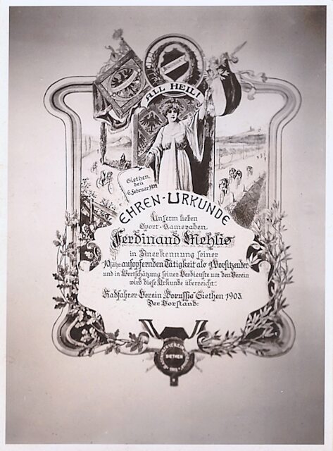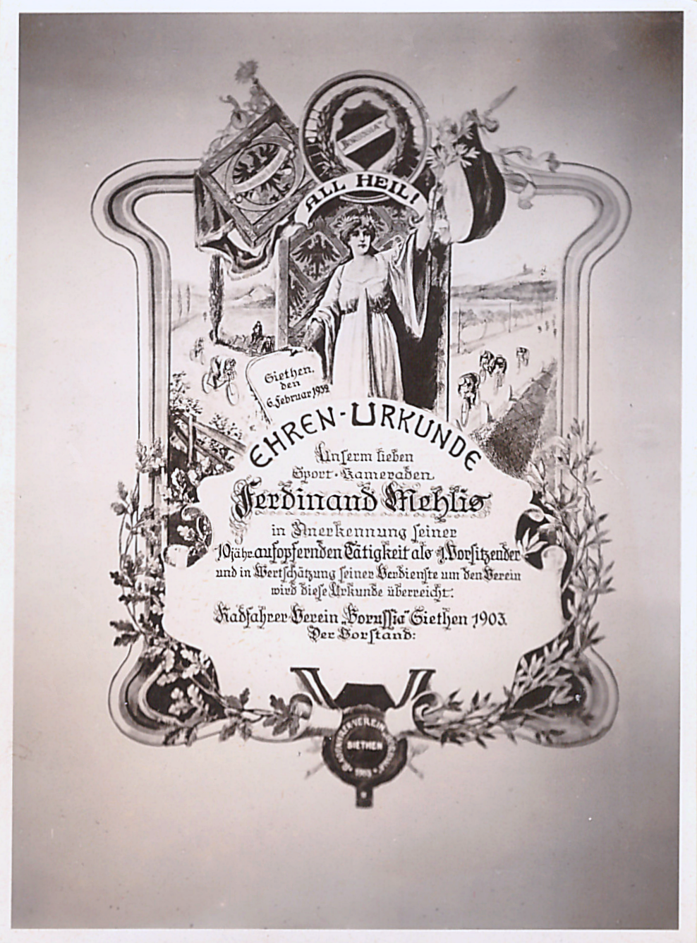 Hier nun eine schöne Ehren-Urkunde für das aufopfernde Tun im Fahrrad-Radfahr-Vereins des Dörfchens Siethen.