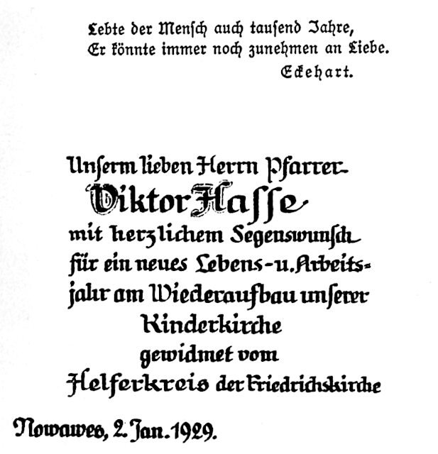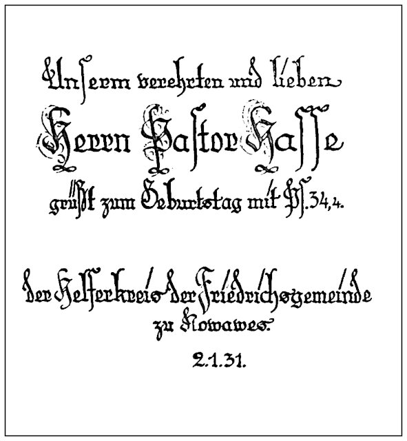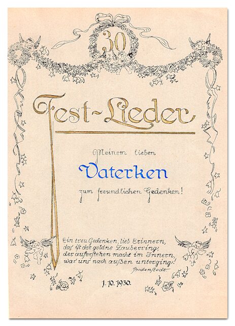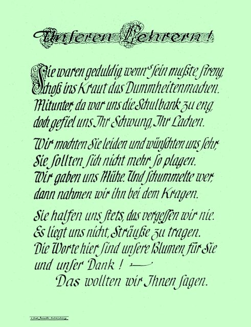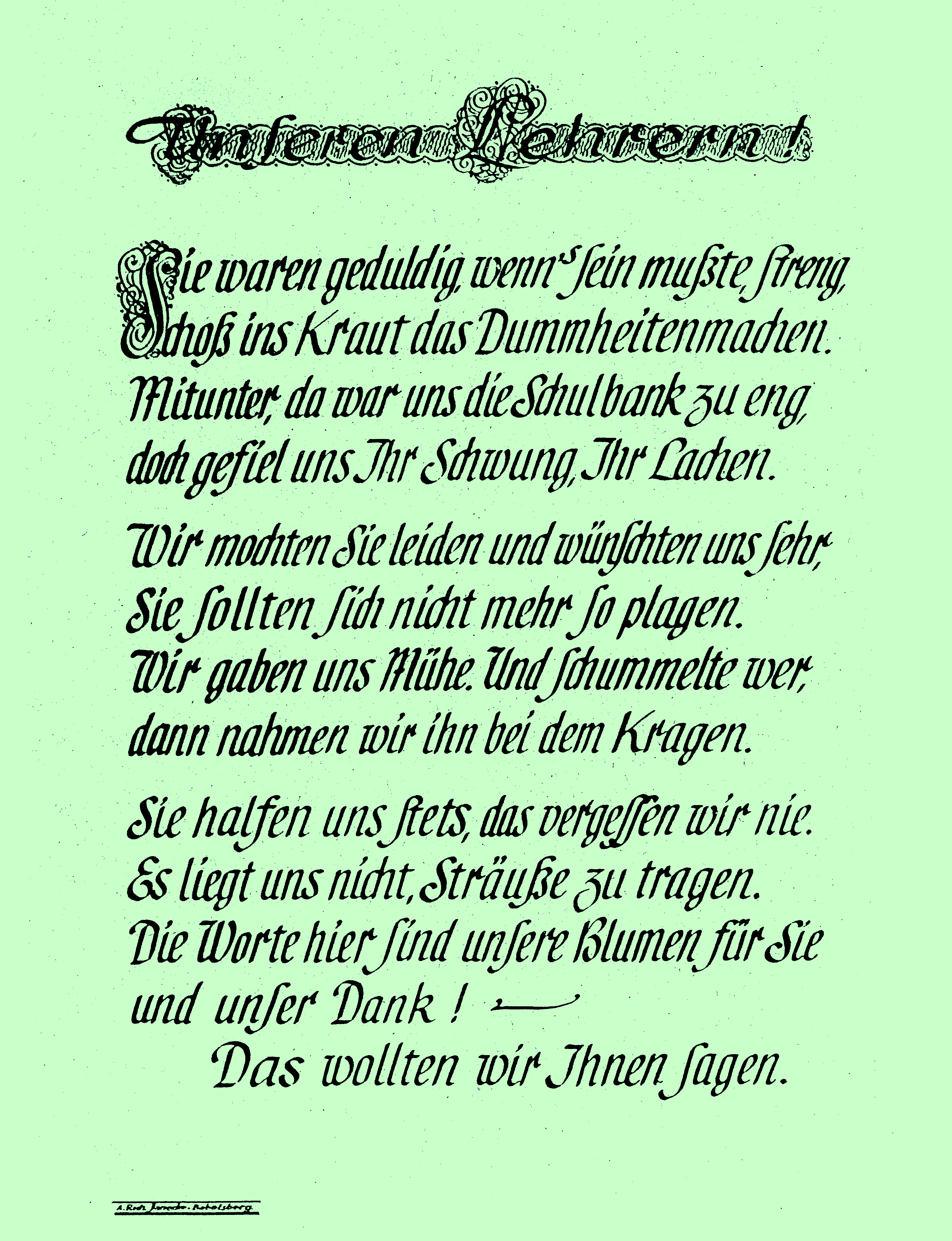 In diesem Dokument sehen wir einige Beispiele der Schriftgestaltung, mitunter geschmückt mit Zeichnungen. Der Schreiber der Blätter war Alfred Richard Janecke (1900–1983 in Nowawes => Potsdam-Babelsberg. Zumeist handelt es sich um Kundenaufträge, die vor der Auslieferung als Muster kopiert wurden.
