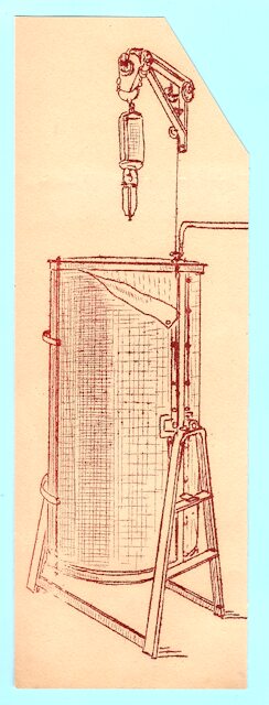 Einfache Kurzbeschreibung: Der hier abgebildete senkrecht stehende, mit einer Leinendecke bespannte Glaszylinder konnte um 90° in die Waagerechte geschwenkt werden. Dann wurde der Glaszylinder mit dem Transparent-Original und dem speziellen Lichtpauspapier belegt und diese mit der Decke festgespannt. Nach der Wieder-Ausrichtung in die Senkrechte wurde von oben durch den Glas-Zylinder eine Kohlestab-Lampe mit extrem hellem, ja gleißendem Lichtbogen geführt, die das spezielle Lichtpauspapier belichtete. Nur dort, wo sich auf dem durchscheinenden Transparentpapier die schwarzen Darstellungen (Zeichnungslinien, Text) befanden, wurde das Spezial-Papier nicht belichtet.
