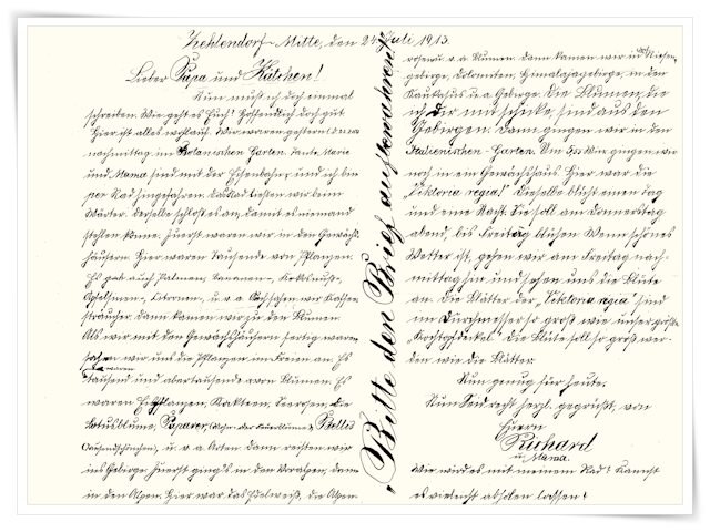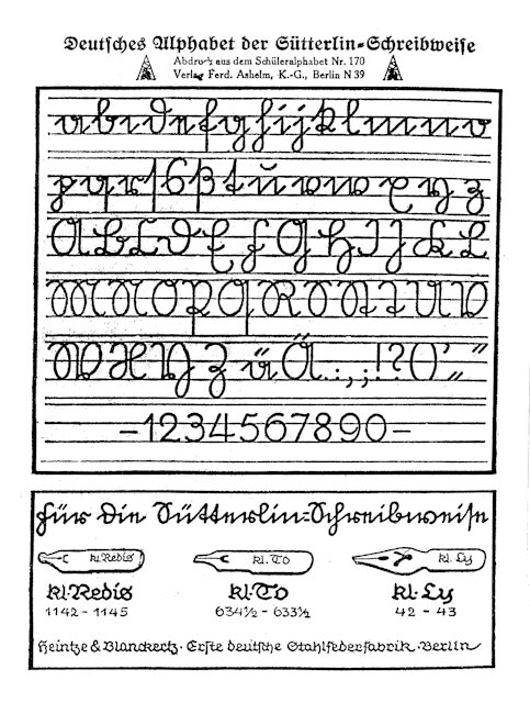 Drei Jahre nach Richards Brief führte das Preußische Kulturministerium die deutsche Ausgangsschrift ein, unter der Bezeichnung > Sütterlin < bekannt. Das Alphabet in der Sütterlin-Schreibweise, mit vereinfachten und senkrecht gestellten Buchstaben. Im Jahre 1911 hatte Sütterlin den Auftrag erhalten, aus der deutschen Kurrentschrift (siehe erstes Bild) eine einfachere Schreibweise und dafür eine zweckmäßige Schreibfeder zu entwickeln. Jene Schrift wurde dann auch ab 1915 gelehrt – aber 1941 von den Nationalsozialisten, also nach bereits 26 Jahren, verboten.